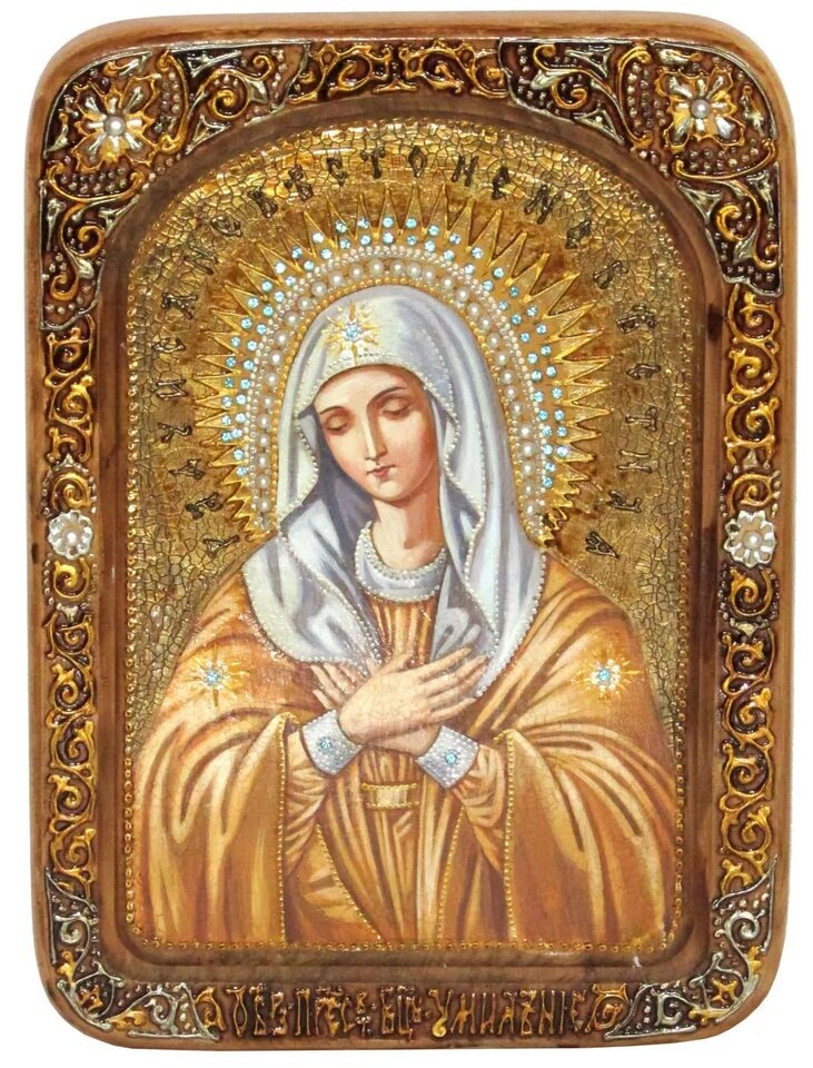 О, Пресвята́я Де́во Богоро́дице, Христа́ Царя́ и Бо́га на́шего Ма́ти, умиле́ния сокро́вище и ми́лости исто́чниче, душеспаси́тельных даро́в блага́я Пода́тельнице и скорбя́щих душ благода́тная Уте́шительнице! К Тебе́ с любо́вию припа́даем и пред свято́ю ико́ною Твое́ю смире́нно мо́лимся: умоли́, Влады́чице, возлю́бленнаго Сы́на Твоего́, Христа́ Бо́га на́шего, поми́ловати и спасти́ нас, погиба́ющих во гресе́х; вдохни́ в ду́ши на́ша покая́ние и́скреннее и умиле́ние богоуго́дное, пода́ждь моли́твам на́шим сле́зы очисти́тельныя; благопотре́бная житию́ вре́менному и ве́чному спасе́нию ми́лостиво, Госпоже́, нам да́руй; мир умири́, святы́й храм сей [или́: святу́ю оби́тель сию́] до́бре сохрани́, безмяте́жие и изоби́лие плодо́в земны́х нам низпосли́, и при кончи́не живота́ на́шего не лиши́ нас Ма́терняго Твоего́ заступле́ния и по́мощи, да предста́тельством Твои́м безбе́дно пре́йдем мыта́рства возду́шная и сподо́бимся унасле́довати Ца́рствие Небе́сное. Ей, Цари́це Всеблага́я, всех ра́достей Ра́досте и всего́ ми́ра христиа́нскаго утеше́ние! Помози́ нам и ны́не, и егда́ наипа́че по́мощи Твоея́ святы́я востре́буем, и спаси́ нас Ма́терними мо́литвами Твои́ми ко Христу́ Бо́гу, Ему́же со Отце́м и Святы́м Ду́хом подоба́ет вся́кая сла́ва, честь и поклоне́ние, ны́не и при́сно, и во ве́ки веко́в. Ами́нь.