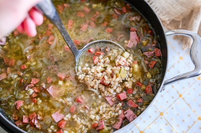 Хорошо промойте ячмень и поставьте его на плиту в кастрюле среднего размера. Добавьте 4 стакана воды, щепотку соли и варите ячмень на медленном огне до готовности. Пока варится ячмень, подготовьте другие ингредиенты. Нарежьте говядину кубиками, сосиски и бекон из индейки небольшими квадратиками. Нарежьте лук и картофель кубиками. Нарезать кубиками маринованные помидоры и отложить все ингредиенты до тех пор, пока они не понадобятся. Поставьте на плиту кастрюлю для супа объёмом 6 литров и добавьте в неё масло. Включите средний огонь, добавьте говядину и обжаривайте, помешивая, до слегка коричневого цвета. Добавьте нарезанный лук и готовьте, пока лук не станет мягким и слегка подрумянится. Добавьте нарезанный кубиками картофель, соль, чёрный перец и обжаривайте ещё 2 минуты. Добавьте воду и доведите суп до кипения. Немного убавьте огонь и варите суп на медленном огне, пока картофель не приготовится. Когда картофель будет готов, можно добавлять в суп ячмень. Просейте ячмень и добавьте в ка
