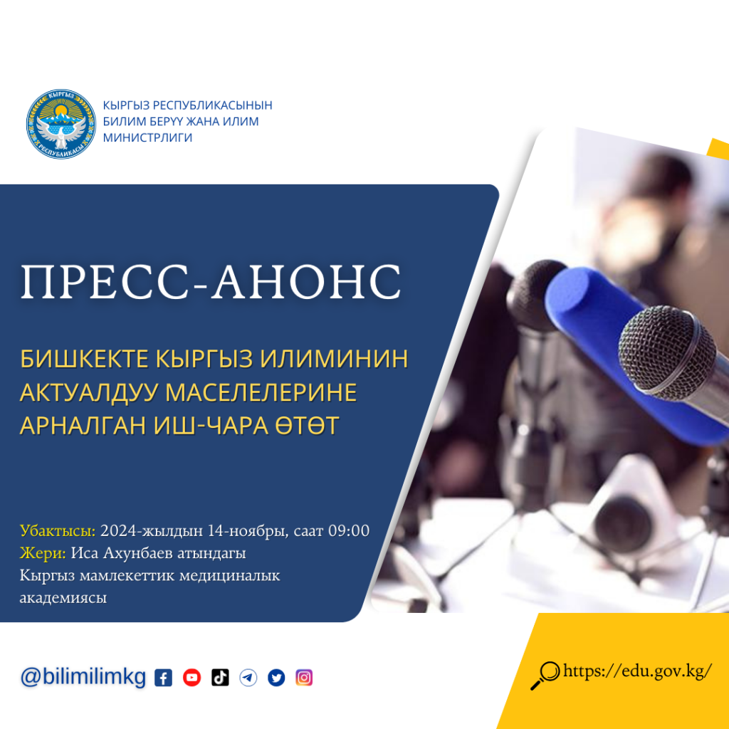 14-ноябрда Кыргыз мамлекеттик медициналык академиясында Кыргызстандын илимий прогрессине арналган иш-чара өтөт. “Кыргызстанда илимди өнүктүрүү – Ийгиликке жол” конференциясынын катышуучулары академиялык илимдин абалы, билим берүү тармагындагы изилдөөлөрдүн жана санариптештирүүнүн салымын талкуулашат. Ага жогорку даражалуу аткаминерлер катышып, университеттердин эл аралык рейтингдердеги позицияларын талкуулашары күтүлүүдө. 🎉 Бишкекте Кыргызстандын илиминин өнүгүшүнө арналган иш-чара өтөт. 🔍 14-ноябрда Иса Ахунбаев атындагы Кыргыз мамлекеттик медициналык академиясында “Кыргызстанда илимдин өнүгүшү – ийгиликке карай жол” конференциясы өтөт. 👥 Катышуучулардын арасында мамлекеттик катчы Сүйүнбек Касмамбетов жана билим берүү министри Догдуркүл Кендирбаева бар. 📊 Негизги көңүл академиялык илимдин абалына жана билим берүүдөгү санариптештирүүнүн ролуна бурулат. 💡 Катышуучулар Кыргызстандын ЖОЖдорунун эл аралык рейтингдердеги позицияларын кантип жакшыртууну жана медицинага инновацияларды ки