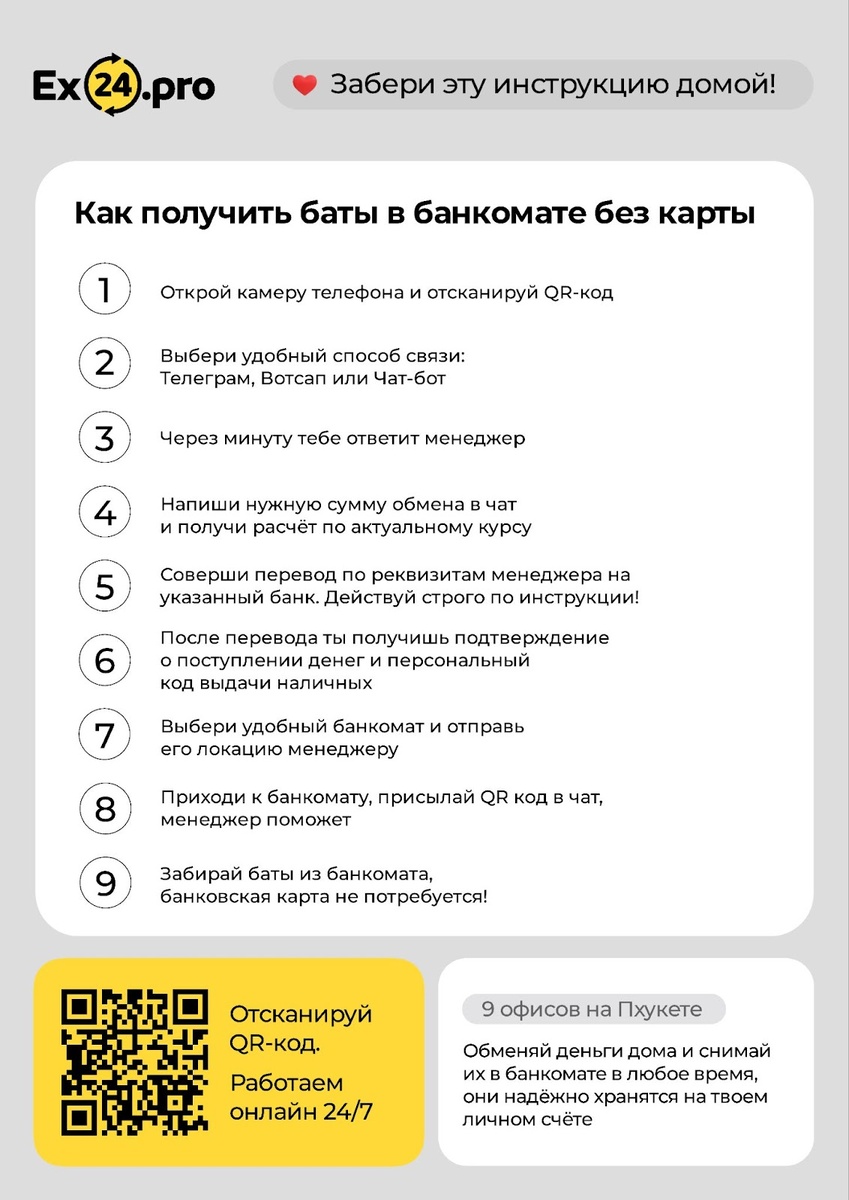 Таким образом, Ex24.pro предлагает гибкие и безопасные способы обмена валюты по всему Таиланду. Вы можете использовать наш удобный Telegram-бот, посетить один из наших офисов на Пхукете или Паттайе, либо воспользоваться ближайшим банкоматом для получения наличных.