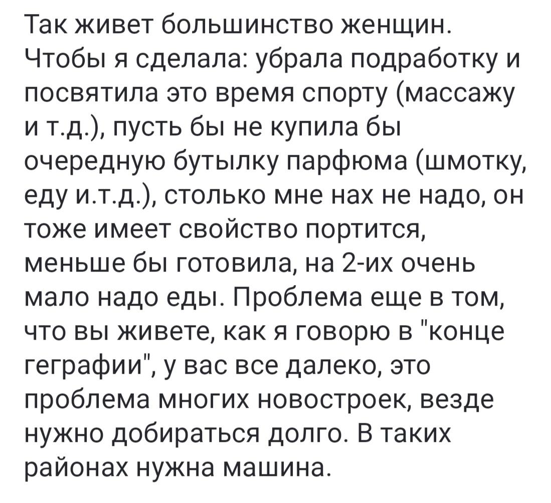 Здравствуйте, мои дорогие друзья и гости канала. Для тех, кто впервые заглянул на огонек, расскажу о себе: Меня зовут Светлана, мне 42 года, я похудела на 23,5 кг с марта 2022 года, начальный вес 94,5 кг. Вот уже больше года топчусь на месте. На своем канале я рассказываю о жизни, поездках, покупках, делюсь рецептами и бесконечно пытаюсь похудеть. При написании статьи никогда не знаешь, какую реакцию она может вызвать. Порой советы и примеры, которые дают люди, приводят меня в недоумение. Вот, например, такой комментарий прочла сегодня и честно, немного удивилась. Покупка духов - это единовременная акция. Я сейчас потратила на них энную сумму, а потом забыла на год. А вот спорт, массаж и многие другие процедуры требуют времени и конечно же средств. Вот и возникает вопрос: Чем я буду оплачивать все свои хочу, если брошу подработку, освободив время?😅 А помимо меня самой есть ещё ребёнок, которого надо одеть, обуть, а растёт он очень быстро и до недавнего времени все расходы на со