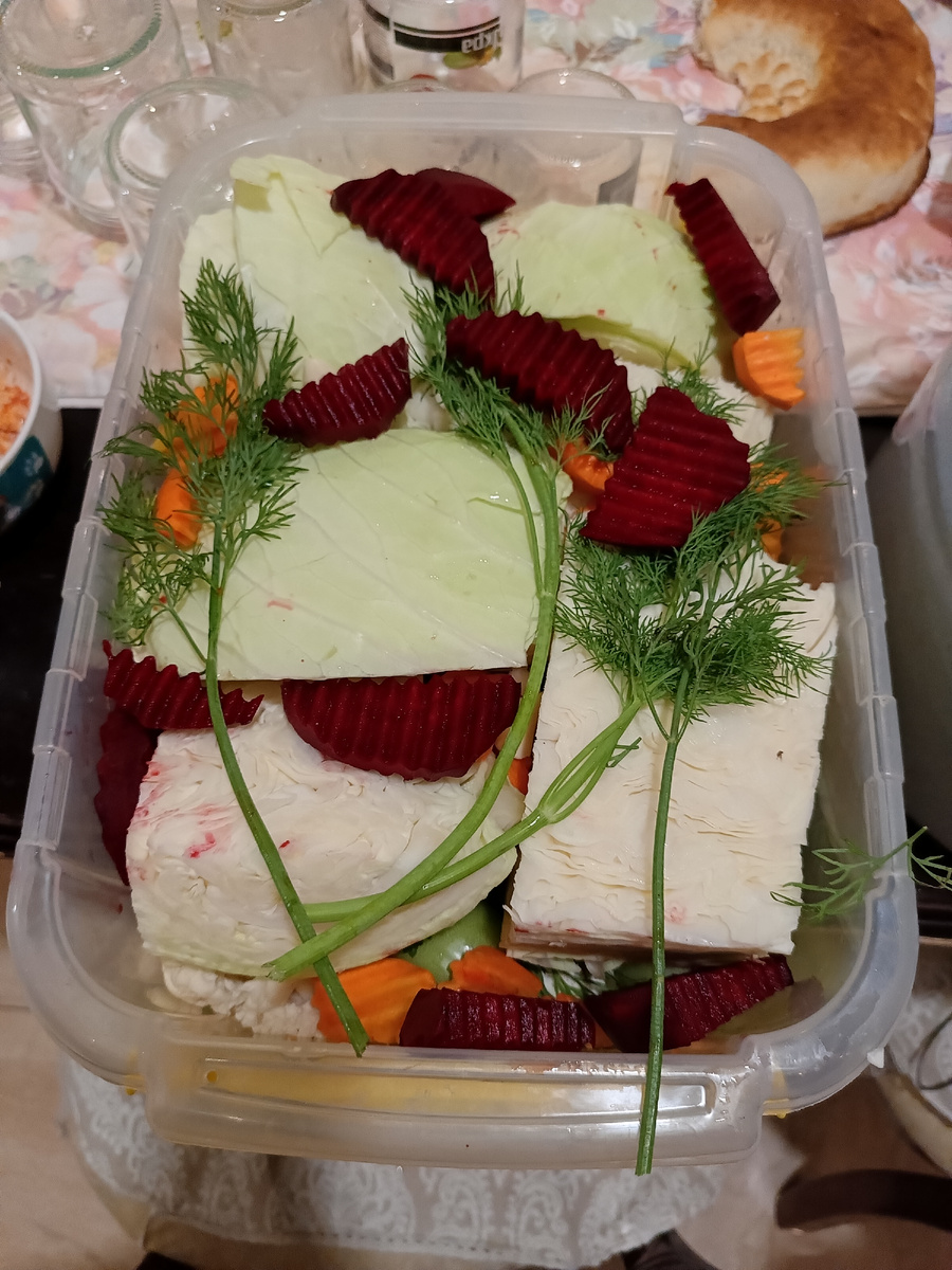 Этому замечательному рецепту соленостей меня научила свекровь, она армянка. Как только в Ереване начинает холодать, она ставит целую бочку таких разносолов на балконе ,и кушают их потом потихоньку всю зиму. Итак, приступим. Я укладываю всё это дело или в большие контейнеры, или в эмалированное ведро. Берем цветную капусту, можно сразу несколько качанов, разделяем на соцветия. Дальше в ход идёт обычная белокочанная капуста, режем её крупными дольками. Затем берем огурчики, отрезаем у них кончики с двух сторон. Надеюсь не нужно говорить, что все овощи конечно помыты😅. Далее зелёные помидоры, у них делаем надрезы крест накрест, чтобы они лучше впитали рассол и быстрее просолились. В качестве приправ я беру лавровый лист, листовой сельдерей (он даёт основной аромат), чеснок(чем больше, тем лучше), листья хрена, зонтики укропа, перец горошек(у меня разноцветный), можно добавить семя кориандра, морковку режем красиво фигурным ножом, в одну порцию я ещё добавила свёклу, тогда солёности прио