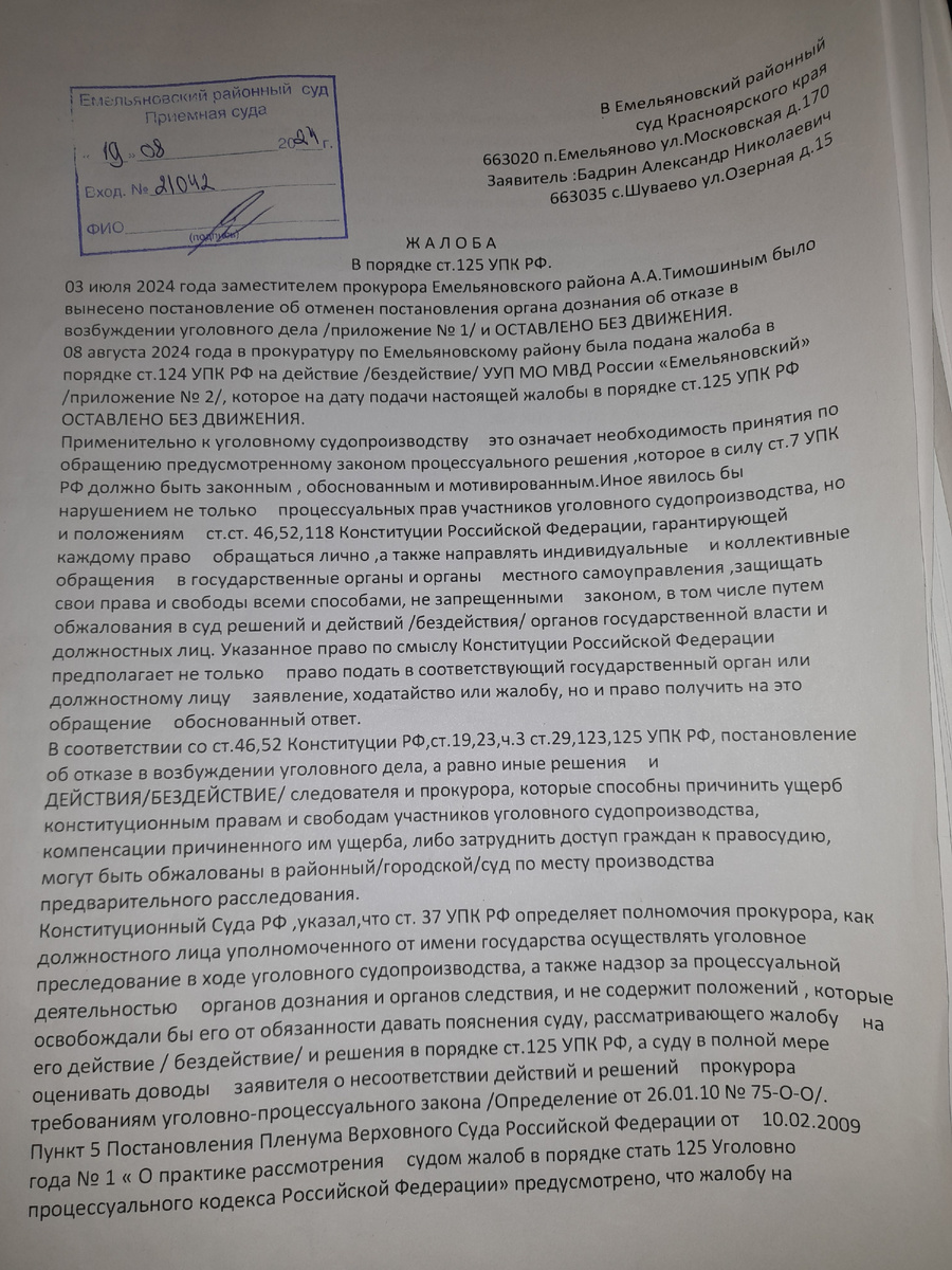 Добрый вечер мои подписчики и посетители моего канал.Сегодня расскажу как осуществляется правосудие в отношении прокуратуры Емельяновского района по жалобе в порядке ст.125 УПК РФ Подана жалоба а так как суд не порядочен по срокам рассмотрения жалобы, то подано вот такое заявление ТИШИНА.Начинаем шевелить краевой суд который "сливает" информацию в районный суд.Тот спешно готовит ответ факт слива и задним числом подтверждается конвертом направления ответа но лед БЕЗДЕЙСТВИЯ ТРОНУЛСЯ. суд как всегда мои надежды по изготовлению определения задним числом ОПРАВДАЛ сопроводительное письмо от а фактически направлено получаем вот такой судебный опус.Постановлением назвать сложно подаем апелляционную жалобу опять ТИШИНА.Подаем жалобу опять пошел "слив".Пришла вот такая информация в один день подачи жалобы только конверт с датой подтверждает задним числом изготовлена информация потом получаем информацию с краевого суда "своевременно" направленную потом получена вот такая информация.За