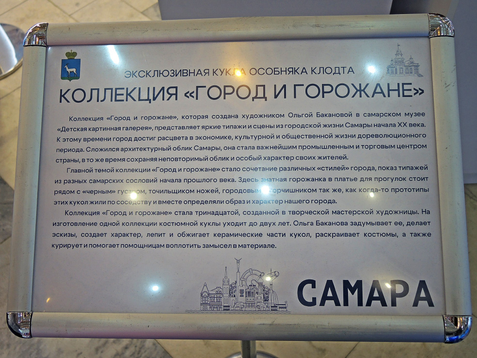 4 ноября в Самаре в фойе здания историко-краеведческого музея имени Алабина открылась выставка «Самара». Она стала своеобразным продолжением выставки «Россия», которая работала на ВДНХ. Насколько я понял, в оформлении новой выставки использованы технологии и декорации, которые представляли Самарскую область там. На выставке «Самара» можно будет познакомиться со всеми районами и крупными городами области, по заявленному плану она будет открыта до конца января 2025 года. Для посетителей каждый день, кроме понедельников, работают различные интерактивные зоны, мастер-классы, лекции и специальные мероприятия. Вход свободный. Первая неделя выставки была посвящена столице региона городу Самаре. Одним из гостей выставки в этот период был музей Детская картинная галерея. Его работники представили часть одной из коллекций авторских кукол мастерской Ольги Бакановой, которая работает при музее. Коллекция называется «Город и горожане. Самара конца XIX - начала XX веков» и представляет собирательные