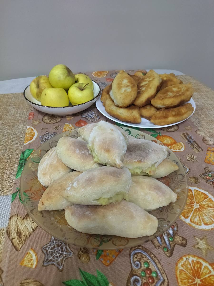Для теста: Молоко 150 мл. Вода 100 мл. Дрожжи 40 гр. Соль 1 ч.л. Масло растительное 30 гр. Мука пшеничная 550-650 гр. (Зависит от вашей муки) Завести тесто, дать подняться дважды. Разделить тесто и скатать примерно одинаковые шарики. Каждый шарик раскатать скалкой, положить начинку, у меня это примерно 1 ст.л. защитить края и готовить любимым, способом. Половину запекла в духовке при 180 градусах примерно 20 минут. Начинка для духовки оказалась жидковатой. Вторую половину пожарила. Зато для жарки начинка оказалась идеальной. Ни один пирожок не раскрылся. жарю обычно на среднем огне по три минуты с каждой стороны. Приятного аппетита!
