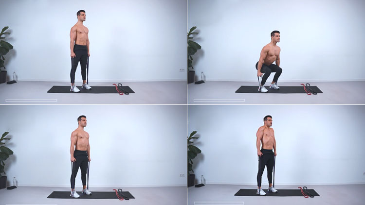 1. Приседания с пожиманиями плеч. Берём длинную резинку руками за противоположные концы, наступаем на неё ногами. Стоим ровно, ноги на ширине плеч. Всё готово для выполнения упражнения. Приседаем, спину держим ровно. Поднимаемся. Пожимаем плечами – отводим плечи вверх. Упражнение из четырёх шагов – приседаем, поднимаемся, поднимаем плечи, опускаем плечи. Идём дальше.