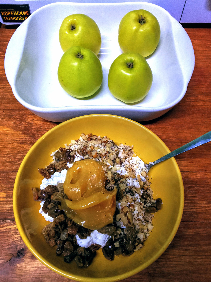 Доброго всем вечера! Решили с Мамуликом приготовить сегодня лёгкий ужин, запечённые фаршированные яблоки. Хочу с вами поделиться рецептиком, а вдруг вы тоже захотите приготовить😉 Нам нужны конечно же яблоки А для начинки у нас творог, изюм, грецкие орешки измельчённые и мёд. У яблока срезала макушечку и удалила внутренности Заполнила начинкой Можно было в начинку добавить корицу, я забыла, сверху посыпала, накрыла макушечкой И в духовку на 190 градусов на пол часа Мёд вытек, но это не страшно, на вкусе совсем не отразилось) ♥♥