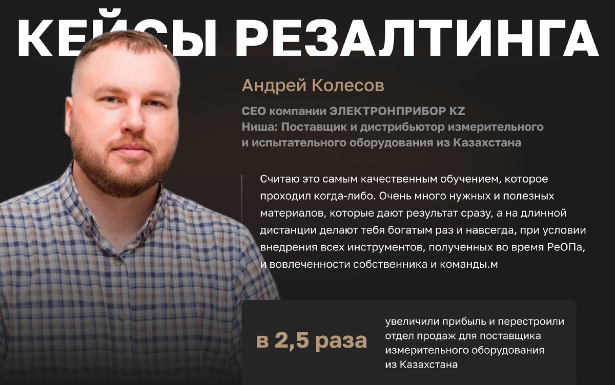 Андрей пришёл на РеОП, потому что понял — без системы продаж компания не будет расти в долгосрочной перспективе даже с хорошей бизнес-моделью. Он уже видел успешные ключевые программы, поэтому доверился команде. В результате, хотя и переживал, что невозможно пройти обучение до конца.