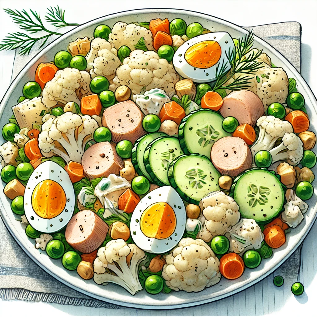 - Замените картофель отварной цветной капустой, вместо колбасы используйте отварное куриное филе, а майонез замените на соус из греческого йогурта с горчицей и лимонным соком.