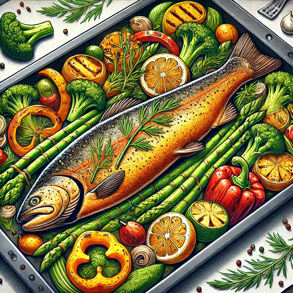 - Заверните рыбу и овощи (спаржа, болгарский перец, брокколи) в фольгу, добавьте специи, немного лимонного сока, запекайте при температуре 180°C около 20 минут.