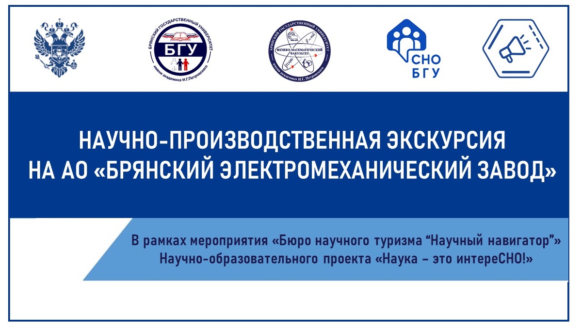 В рамках взаимодействия с АО «Брянским электромеханическим заводом» и реализации программы мероприятий «Бюро научного туризма «Научный навигатор» научно-образовательного проекта «Наука – это интереСНО!» при поддержке ФГБУ «Всероссийский научно-исследовательский институт радиоэлектроники» и Минпромторга России в рамках госзадания Минпромторга России «Популяризация профессий в радиоэлектронной промышленности» студенты физико-математического факультета в сопровождении и.о. заведующего кафедрой экспериментальной и теоретической физики Н.В. Митрошенкова посетили научно-производственные подразделения и цеха завода. Программа научно-производственной экскурсии предполагала знакомство студентов со спектром должностей и профессий предприятия, их ролью, задачами и содержанием труда в конкретном производственном процессе, требованиями работодателей к компетенциям персонала, а также презентацию научно-исследовательских проектов завода. В настоящее время завод осваивает образцы техники радиоэлектрон