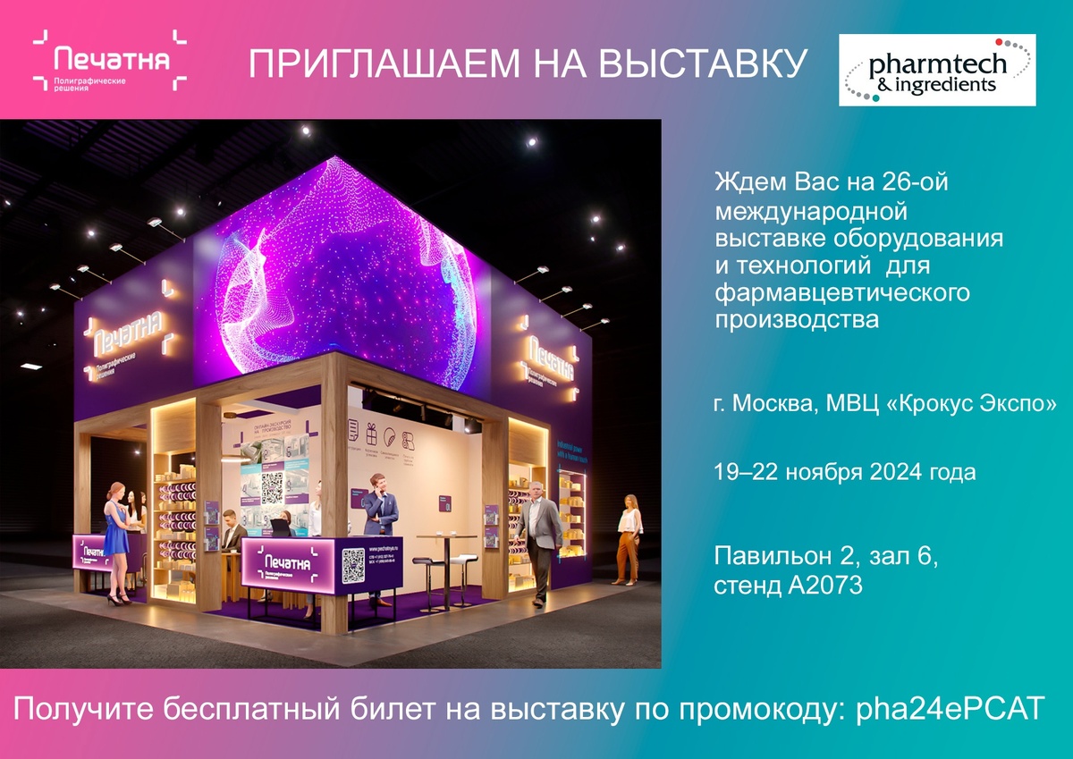 Приглашаем посетить наш стенд № А2073 в зале №6 павильона №2 на выставке Pharmtech & Ingredients 2024, которая пройдет с 19 по 22 ноября в Москве, в выставочном центре «Крокус Экспо».