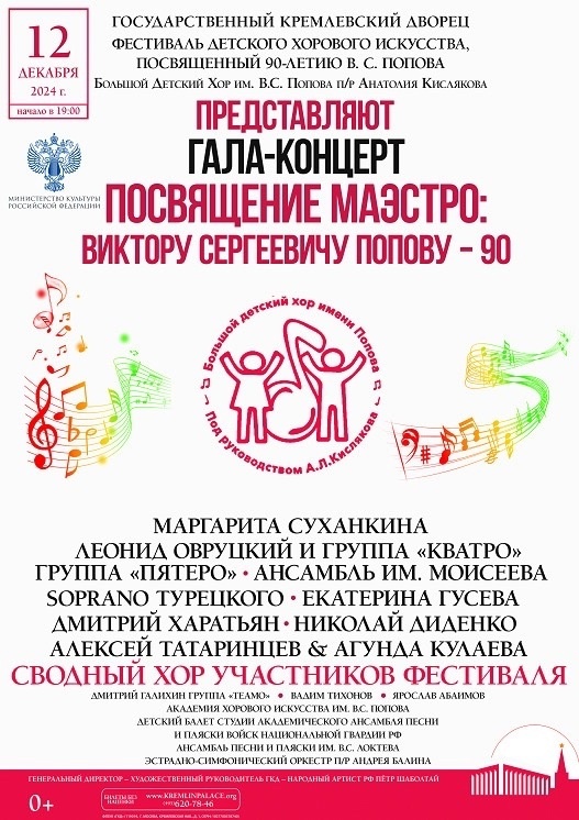Друзья, хочу проинформировать , что 12 декабря 2024 года в Кремлёвском дворце пройдёт фестиваль детского хорового искусства, посвящённый 90-летию со дня рождения Виктора Сергеевича Попова, создателя и художественного руководителя Большого детского хора Всесоюзного радио и Центрального телевидения СССР. Несмотря на то, что Виктора Сергеевича нет с нами уже много лет. Ко дню его рождения в декабре часто проводятся концерты. В этом году отмечается 90-летний юбилей.