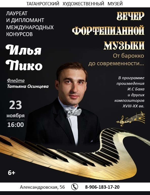 23 ноября в Таганрогском художественном музее выступит пианист, лауреат и дипломант международных конкурсов Илья Пико. Илья Пико окончил Ростовскую государственную консерваторию им. С.В. Рахманинова (класс профессора Сергея Осипенко), Университет искусств Folkwang в Германии, в городе Эссен (класс профессоров Арнульфа фон Арнима, Тиля Энгеля и Бориса Блоха), где получил квалификацию «Мастер музыки». В период обучения выступал с сольными программами во многих городах Европы, организовывал и проводил концерты. Сейчас Илья Пико – преподаватель и концертмейстер Таганрогского музыкального колледжа. «На историко-музыкальном вечере фортепианной музыки «От барокко до современности», который состоится в Таганрогском художественном музее, прозвучат композиции И.С. Баха, Д.Д. Шостаковича, С.В. Рахманинова и других композиторов ХVIII-ХХ веков. Начало концерта в 16 часов», — рассказали в ТХМ. В программе также принимает участие лауреат республиканских конкурсов, артистка Таганрогского муниципальног