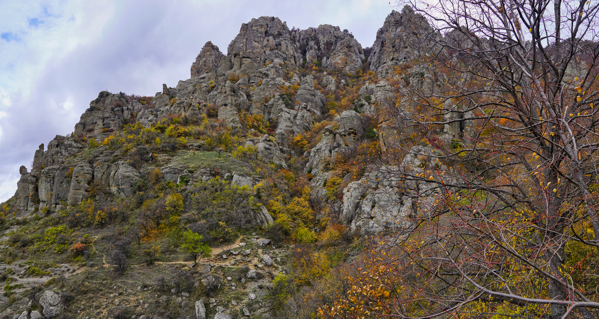 На Южный Демерджи в Долину Привидений мы собирались еще в октябре. Но все время что-то мешало, Но в начале ноября практически все сложилось. Почти сложилось. Почти, потому что планировали поход на 3 ноября. Но в силу ряда вполне объективных причин перенесли на следующий день. Хотя на 4-е синоптики обещали всякие прелести в виде сильного ветра и дождя после 17-00 (что меня основательно беспокоило). Но раз решили, то решили. Собирался почти тот же коллектив, что и в ущелье Марьям-Дере (https://dzen.ru/a/Zxj6e9G0s1zVE20p ). Но в силу ряда причин наши ряды поредели и на Демерджи отправилось 7 человек из 13. И то с заменами. Но ... Но ведь отправились. Для начала пару слов о Долине Привидений. Начну с того, что это не какая не долина, а склон горы. В силу того, что массив Демерджи сложен из конгломерата, породы весьма не однородной и непрочной, под действием солнца (колебания температур в окружающей среде), воды и ветра происходило (и происходит) неравномерное разрушение скал. А это в св