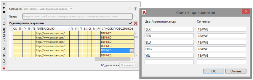 Каталожные данные кабелей добавляются в таблицу «WO(Кабели, многожильные кабели)». С помощью движка нужно переместиться к ячейке Список проводников, дважды кликнуть по полю и нажать на появившуюся справа кнопку. В поля Цвет/идентификатор и Сечение диалогового окна «Список проводников» вводятся соответствующие значения для жил кабеля.