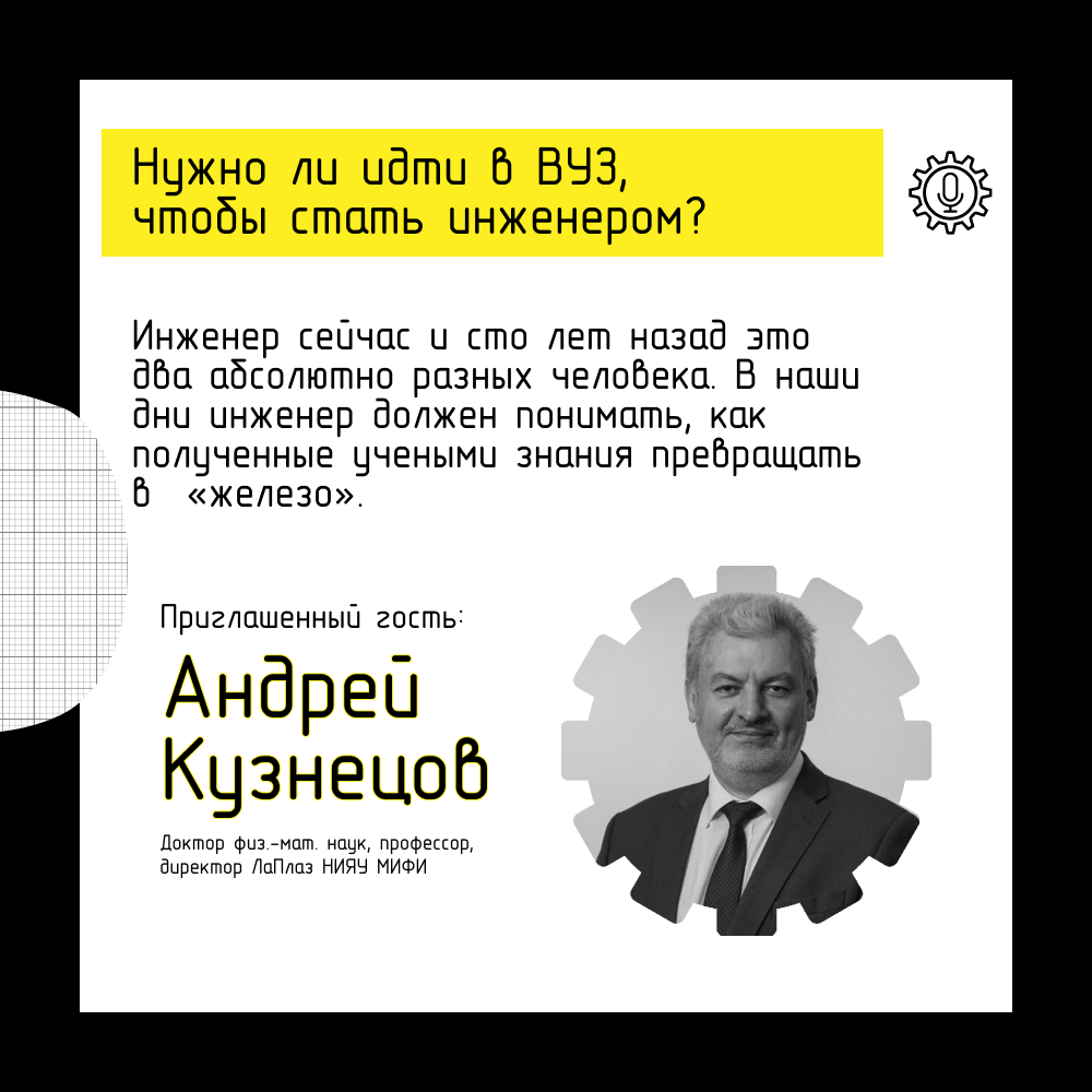 Некоторое время назад мы подробно разобрали беседу ведущего инженерного подкаста, Александра Никонорова с директором института ЛаПлаз, доктором физико-математических наук, профессором, Андреем Петровичем Кузнецовым. По мотивам подготовили для наших читателей полезную выжимку о качествах и навыках современного инженера-исследователя. Нужно ли идти в ВУЗ, чтобы стать инженером? Почему уходят в ИТ? Как воспитать инженера? А что в МИФИ? Следите за нами в Телеграмме, ВКонтакте, на официальном сайте. #инженерный_подкаст#все_ответы_в_науке_МИФИ #десятилетиенауки #популяризациянауки