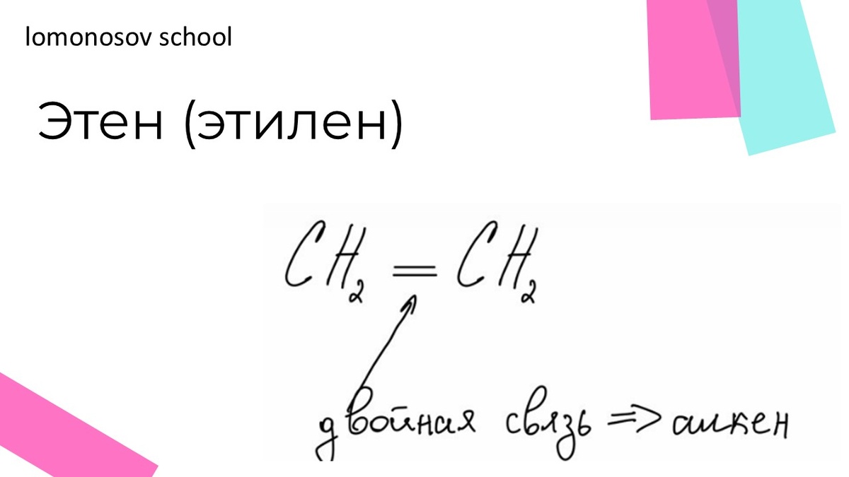 Самый простой представитель этого класса - этилен (этен), состоящий из двух атомов углерода, соединенных двойной связью.