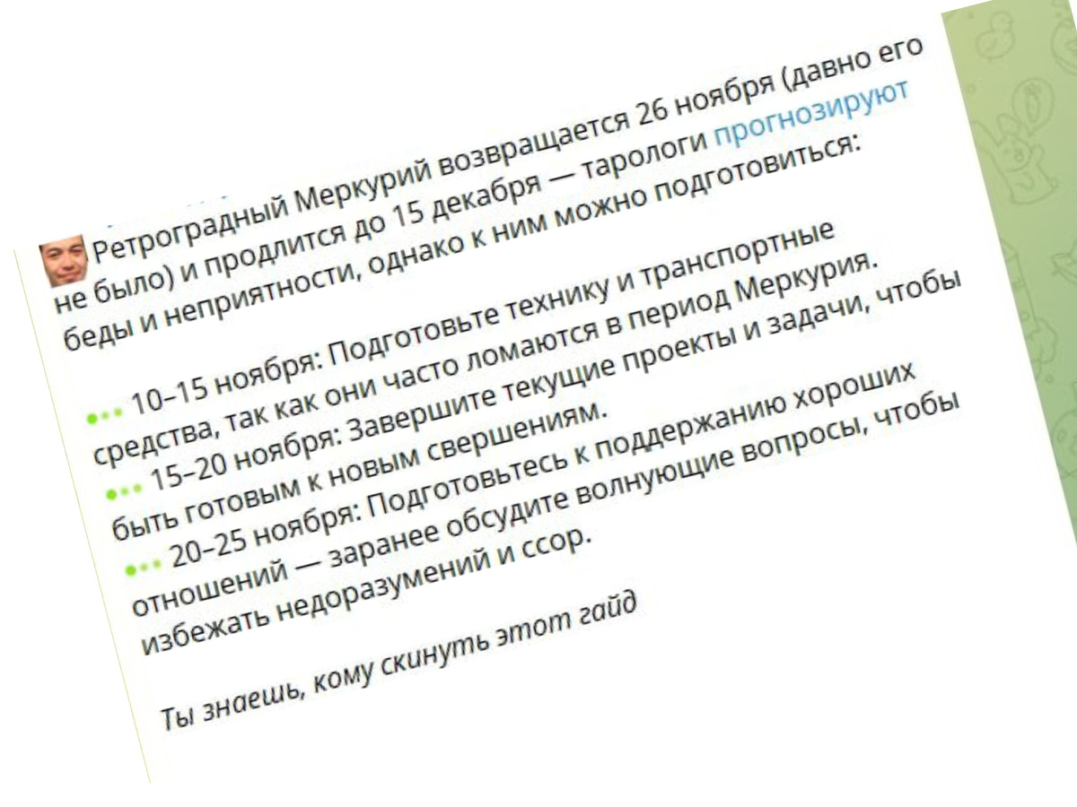Словосочетание уже заездили по поводу и без)) Тем временем, как явление, Меркурий таки будет в ретроградном движении с 26 ноября по 15 декабря, ну, это просто факт. А вот верите ли вы, что это окажет какое-то влияние на вас и ваши обстоятельства - это ваше личное дело) Почему в скрине упомянуты тарологи, а не астрологи? Я же говорю, никто уже не вдумывается в значение слов))) В общем, если вы в корреляцию звёздной карты с земными событиями верите, то для торговли влияние РМ можно считать относительно позитивным и доставать то, что не удалось пристроить в предыдущие периоды, то, что мы на нашем авиточном сленге называем долговисами. В эти три недели такие вещи могут и продаться. Впрочем, к Новому Году вообще много чего продаётся, про что и не подумал бы)) Как будто всем срочно нужно избавиться от старых денег в старом году)))