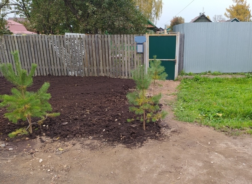 Сажать изначально сосны на утоптанной тропинке к калитке — точно не стоило. Хотя бы потому, что там очень уплотнился грунт. За долгие годы, пока дорожка служила для входа на участок. А уж какая каменистая почва возле дороги — вы и сами видите…