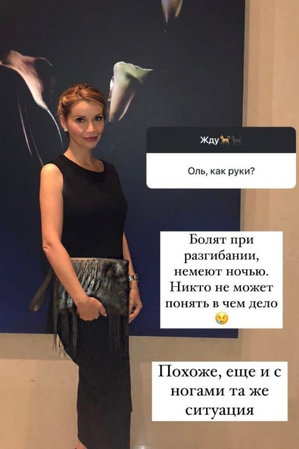 47-летняя Ольга Орлова в прошлом году стала матерью во второй раз. От супруга Валерия Маслова она родила дочь, которую назвали Анной. Певица признавалась, что потратила два года на попытки забеременеть в столь зрелом возрасте. Недавно у нее появились странные симптомы. Ольга жаловалась, что у нее болят руки. Она не понимала причину дискомфорта, поэтому обратилась к медикам. Однако они оказались бессильны. Врачи так и не поставили ведущей никакого диагноза. «Болят руки при разгибании, немеют ночью. Никто не может понять, в чем дело. Похоже, еще и с ногами та же ситуация», — написала в личном блоге она. Ольга Орлова Часть аудитории считает, что это последствия поздних родов. Отметим, что Орлову до сих пор подозревают в том, что она наняла суррогатную мать ради рождения Анны. Некоторые пользователи Сети не могут поверить, что она забеременела и родила самостоятельно в 45 лет. Всю беременность недоброжелатели как под микроскопом разглядывали живот певицы и искали несостыковки в ее словах и
