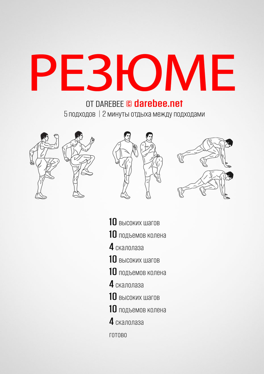 Новый релиз — Резюме. Резюме - идеальная тренировка для тех, кто любит бегать, но у кого мало времени и места для этого. ЦЕЛЬ: кардио ТИП: жиросжигание СЛОЖНОСТЬ: 2 — отлично для начинающих https://darebee.net/rundown-workout.html #darebeenet #дареби #фитнесдома #домашняятренировка #darebee #тренировка #кардио