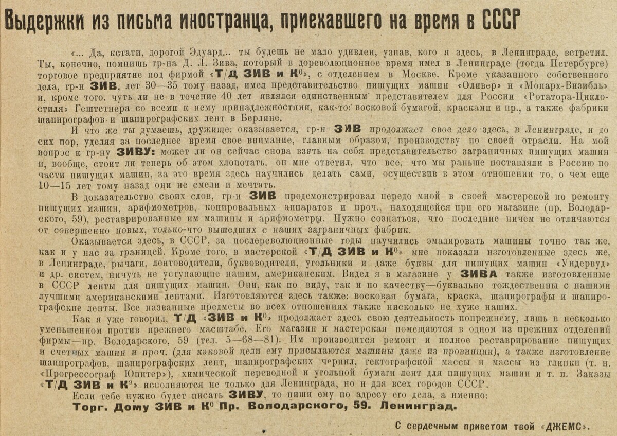Статья "Выдержки из письма иностранца, приехавшего на время в СССР", 1926 год, журнал "Жизнь искусства", прямо скажем, не самое популярное СМИ эпохи НЭП. Откровенно заказной текст с неуклюже скрытой рекламой. Нам глубоко в душе всегда очень хотелось понравиться там у них, и что бы похвалили. Вот "американец Джемс" и хвалит, правда, не талантливо и суконным языком. Замысел был "свеж и оригинален", но не того писку наняли. Уже когда-то писал про Зива, но не пропадать же такой находке! Торговый дом «Зив и К» возродился в Петрограде в 1922 году, правда, прежний адрес Невский проспект, 56 пришлось поменять на проспект Володарского (Литейный), 56, угол Литейного и Невского. Конечно же это была уже не та контора, что при царе. Наверняка, организовали это дело безработные механики прежнего Зива, но это было не "арендное предприятие", как было принято при НЭП, особенно в Москве, а полное товарищество на паях, артель или кооператив. Тот самый угол, но позже, в 1941, налево - Невский, направо - Л