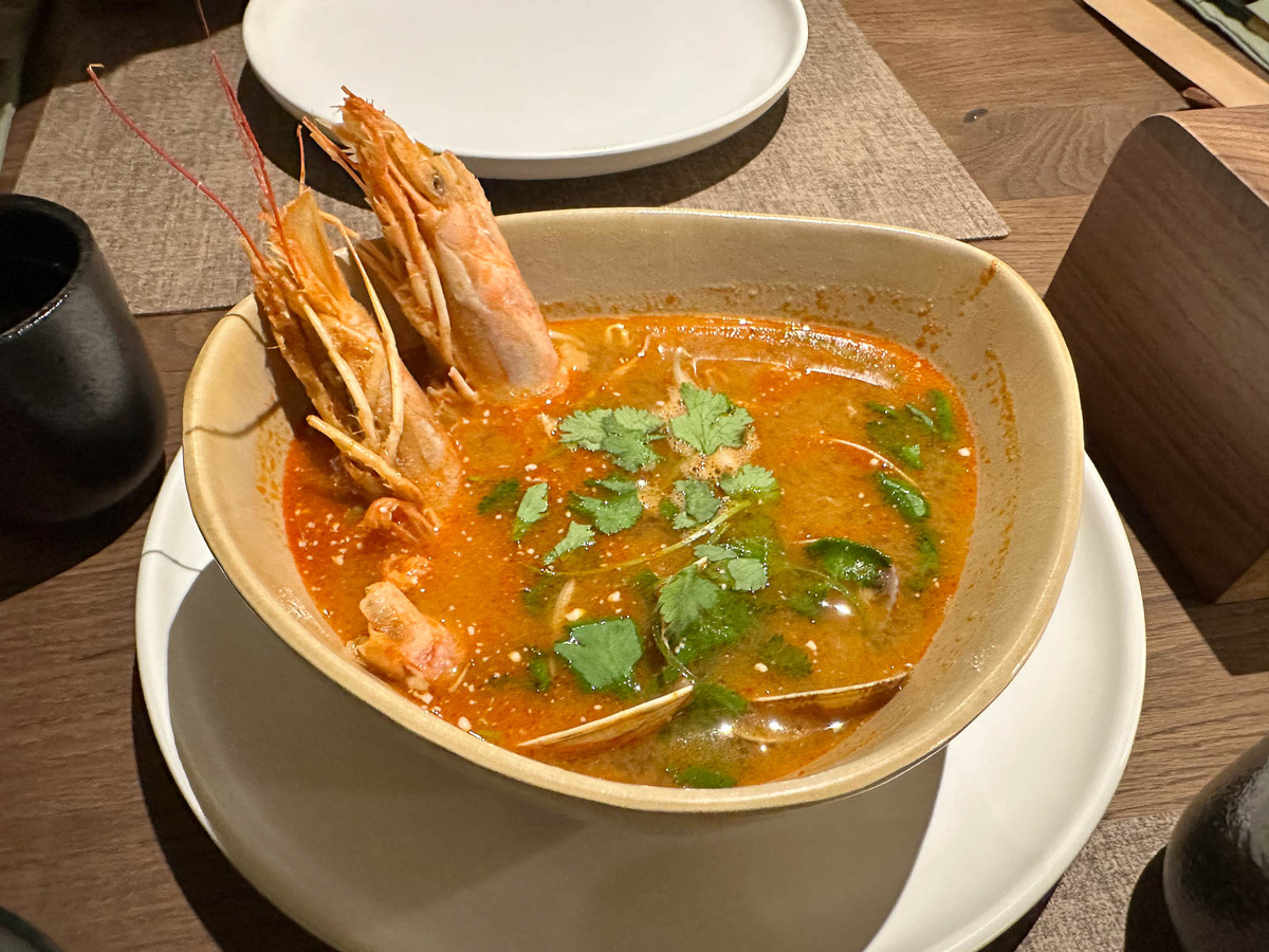 1. В красивой тарелке плотный по жидкости Том Ям с рисом за 20р. Крепкий креветочный бульон сбалансирован пастой Том Ям на отлично.