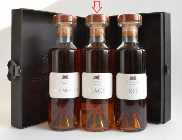 Deau Black Extra — коньяк, полный характера и страсти. Его название Black отсылает к цвету бокалов для слепой дегустации, которые используют мастера погреба. Black — это смесь коньячных дистиллятов в основном из субрегионов Гранд Шампань и Пти Шампань. Цветочный аромат ириса, фиалки, жимолости и апельсинового цвета. Округлый на вкус с маслянистыми нотками и оттенками абрикоса. Вкусный в чистом виде, с колотым льдом или смешанный с соком, тоником или содовой. Описание аромата на контрэтикетке практически совпадает с современным описанием на сайте, а описание вкуса отличается: на сайте - абрикос, на контрэтикетке
