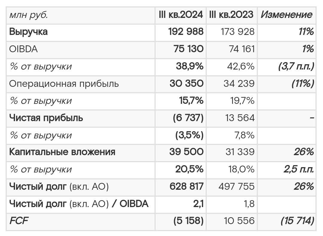 Π²ΡΡΠΎΠΊΠΎΠΉ ΠΊΠ»ΡΡΠ΅Π²ΠΎΠΉ ΡΡΠ°Π²ΠΊΠΈ ΡΡΡΠ΅ΠΌΠΈΡΠ΅Π»ΡΠ½ΠΎ ΡΠ°ΡΡΡΡ. β’ ΠΠ°ΠΏΠΈΡΠ°Π»ΡΠ½ΡΠ΅ Π²Π»ΠΎΠΆΠ΅Π½ΠΈΡΒ Π² 3 ΠΊΠ²Π°ΡΡΠ°Π»Π΅ ΡΠ²Π΅Π»ΠΈΡΠΈΠ»ΠΈΡΡ Π½Π° 26% Π΄ΠΎ 39,5 ΠΌΠ»ΡΠ΄ ΡΡΠ±Π»Π΅ΠΉ. ΠΠ΅ΠΌΠ°Π»Π°Ρ ΡΠ°ΡΡΡ ΡΡΠ΅Π΄ΡΡΠ² Π±ΡΠ»Π° ΠΏΠΎΡΡΠ°ΡΠ΅Π½Π° Π½Π° Π·Π°ΠΊΡΠΏΠΊΡ ΠΎΠ±ΠΎΡΡΠ΄ΠΎΠ²Π°Π½ΠΈΡ. β’ Π‘Π²ΠΎΠ±ΠΎΠ΄Π½ΡΠΉ Π΄Π΅Π½Π΅ΠΆΠ½ΡΠΉ ΠΏΠΎΡΠΎΠΊΒ ΠΏΠΎ ΠΈΡΠΎΠ³Π°ΠΌ ΠΊΠ²Π°ΡΡΠ°Π»Π° ΡΡΠ΅Π» Π² ΠΎΡΡΠΈΡΠ°ΡΠ΅Π»ΡΠ½ΡΡ Π·ΠΎΠ½Ρ -5,2 ΠΌΠ»ΡΠ΄ ΡΡΠ±Π»Π΅ΠΉ. β’ Π§ΠΈΡΡΡΠΉ Π΄ΠΎΠ»Π³ Π²ΡΡΠΎΡ Π½Π° 26% Π³ΠΎΠ΄ ΠΊ Π³ΠΎΠ΄Ρ ΠΈ ΡΠΎΡΡΠ°Π²ΠΈΠ» 628,8 ΠΌΠ»ΡΠ΄ ΡΡΠ±Π»Π΅ΠΉ (Ρ ΡΡΡΡΠΎΠΌ Π°ΡΠ΅Π½Π΄Ρ). ΠΠΎΠΊΠ°Π·Π°ΡΠ΅Π»Ρ ΡΠΈΡΡΡΠΉ Π΄ΠΎΠ»Π³/OIBDA ΠΏΡΠΈΠ½ΡΠ» Π·Π½Π°ΡΠ΅Π½ΠΈΠ΅ 2,1x. β’ Π’ΡΠ΅ΡΠΈΠΉ ΠΊΠ²Π°ΡΡΠ°Π» Π΄Π»Ρ Π ΠΎΡΡΠ΅Π»Π΅ΠΊΠΎΠΌΠ° ΠΎΠΊΠ°Π·Π°Π»ΡΡ ΡΠ»Π°Π±ΡΠΌ, Π²Π΅ΡΡ ΡΠΎΡΡ Π²ΡΡΡΡΠΊΠΈ Π±ΡΠ» ΠΏΠΎΠ³Π»ΠΎΡΡΠ½ ΡΠΎΡΡΠΎΠΌ ΠΏΡΠΎΡΠ΅Π½ΡΠ½ΡΡ