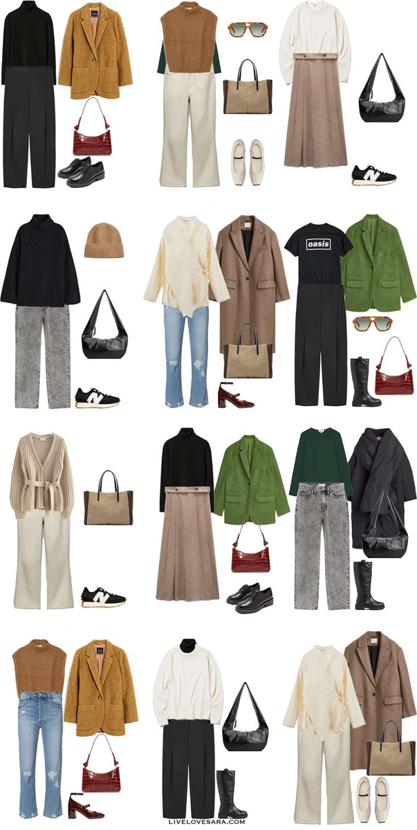 Капсульные гардеробы продолжают набирать популярность, поскольку предлагают стильные и простые решения для повседневной жизни. На изображении представлена коллекция базовых элементов, которые можно комбинировать друг с другом, создавая элегантные и практичные образы. Основу капсулы составляют нейтральные и природные оттенки, такие как бежевый, коричневый, черный и зеленый. Это позволяет создавать универсальные сочетания, которые подходят для различных ситуаций — от офиса до встречи с друзьями. Преимущество таких капсульных коллекций в том, что их можно адаптировать под разные сезоны: достаточно добавить тёплую кофту или лёгкий шарф, и гардероб готов для прохладной осени или весны. Ключевые предметы в подборке — структурированные жакеты, трикотажные свитера, свободные брюки и юбки, которые подчёркивают женственность и в то же время создают комфортный, расслабленный образ. Например, бежевый свитер в сочетании с брюками и классическим пиджаком создаёт деловой, но не перегруженный образ,