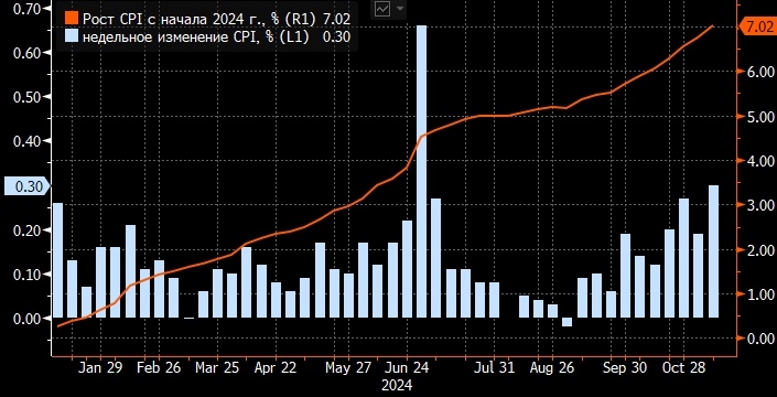 ЦБ повысил годовой прогноз по инфляции для 2024 г. до 8–8,5%, но правительство сохраняет прежний прогноз 7,3% г/г. Меж тем до конца года еще полтора месяца, а инфляция с января уже выше 7%. Потребительские цены в России подскочили на 0,3% за последнюю отчетную неделю (с 6 по 11 ноября). В итоге рост индекса потребительских цен с начала 2024 года уже превысил 7%, что близко к официальному прогнозу правительства в 7,3% по итогам всего текущего года, показали статистические данные в среду. Данные, опубликованные Росстатом вечером в среду, 13 ноября, свидетельствуют о том, что инфляция все еще высока, несмотря на меры по ужесточению денежно-кредитной политики (повышение процентной ставки 25 октября до 21%, самого высокого уровня за последние 20 лет). Цены выросли на 0,19% на предыдущей неделе. Данные показали, что скачки цен на основные продукты питания, такие как масло и другие молочные продукты, были движущей силой общего роста цен. Цены на масло выросли почти на 30% с начала года, тогда