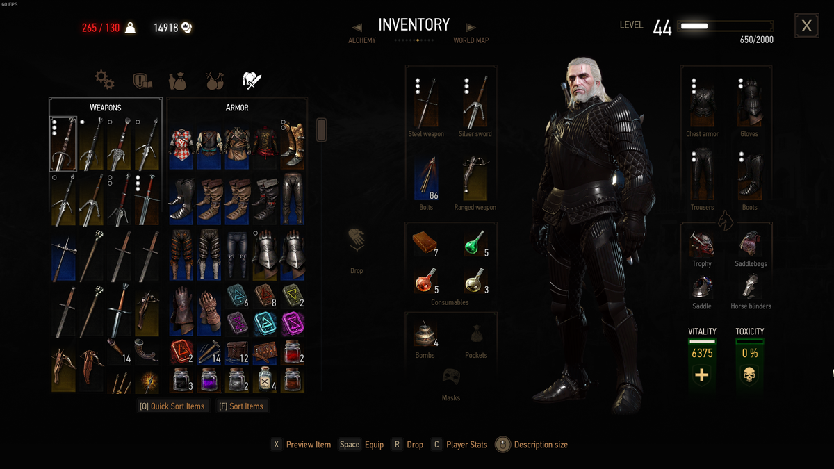 Инвентарь, как и в любой RPG, включает различные виды oружия и брони, которые ты будешь использовать в битвах. В The Witcher 3 Геральт может носить два вида oружия — мечи (первый меч выкован из железа и идеально подходит для сражений с людьми, второй же — серебренный — более хрупкий, но лучше справляется с чудовищами) и арбалет. У каждого предмета есть свои характеристики, такие как урон, материал, слоты для рунных камней и глифов и также описание вида oружия (реликт, предмет мастера, магический предмет).