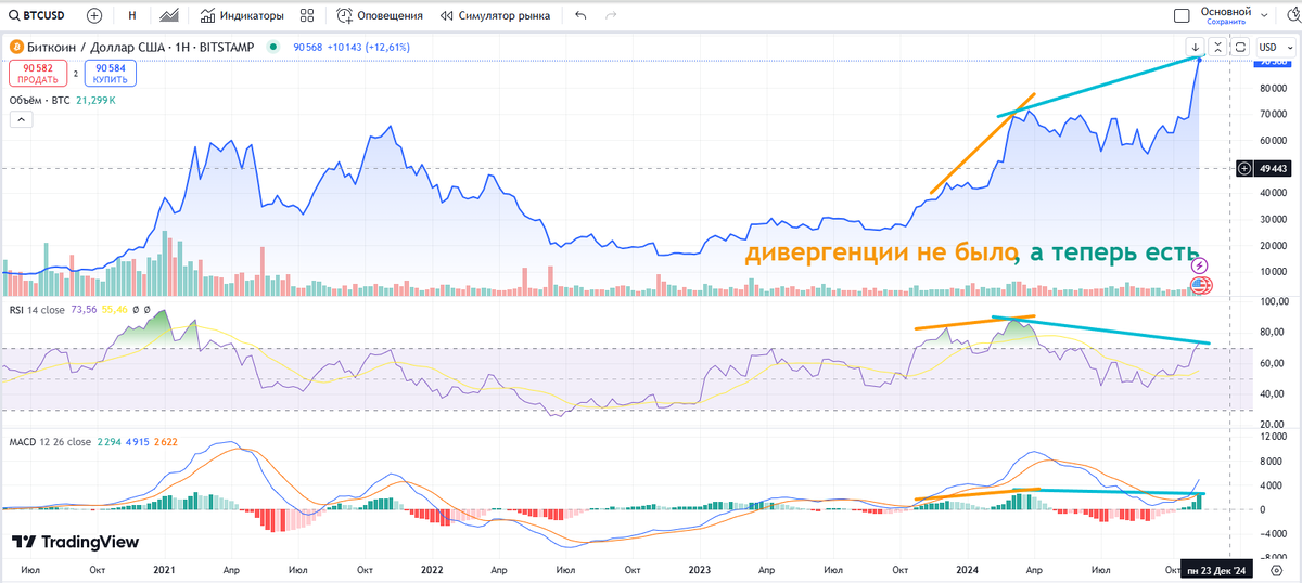 Пока он рос до 60 000, никакой дивергенции не наблюдалось, шли объемы. Теперь же рисуется первая серьезная дивергенция на этом росте. Ее одной недостаточно, чтобы он остановился. Скорее всего по инерции он перевалит за 100 000 и, возможно, дойдет до 120 000. А дальше ожидается глубокий откат.
