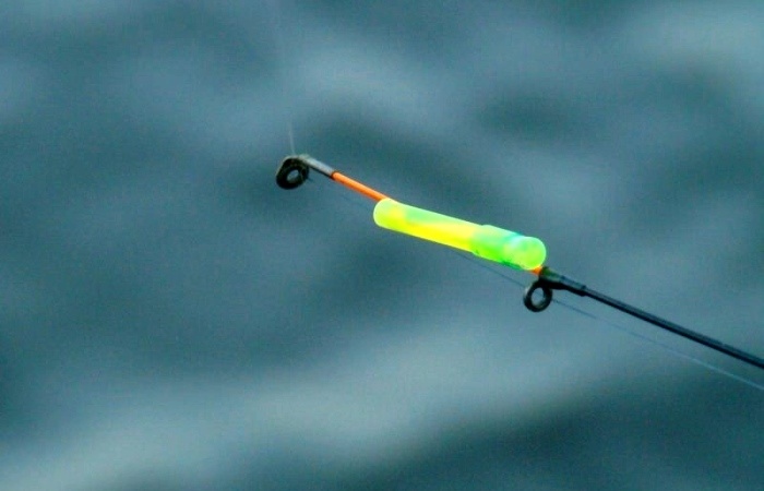 При использовании толстой вершинки удилища я закрепляю поставляемую вместе со «светлячком» трубочку с помощью стяжки для монтажных проводов, обеспечивая надёжную фиксацию «светлячка», который не слетает даже при быстрых поклёвках или резких подсечках. Однако если вершинки фидера слишком чувствительны, монтаж стяжки может привести к их перегрузке. В таком случае я привязываю трубочку со «светлячком» к вершинке с помощью отрезка монофильной лески.