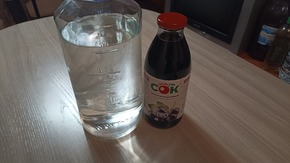 Здравствуйте! Хотите удивить друзей, приготовьте водку со вкусом и ароматом черной смородины. Сделать это не так хлопотно и не очень затратно. Можно конечно сделать настойку, либо что-то типа ратафии, но это немного не то. Отличие ароматной водки от вышеперечисленных напитков в том, что она остаётся прозрачная, без сахара и при этом обладает всеми вкусоароматическими свойствами черной смородины. В идеале использовать ягоды черной смородины, в отсутствии таковых можно прибегнуть к соковому концентрату, как это предложено в ниже. Понадобится 1 кг концентрированного сока. Необязательно брать такой как у меня, можно приобрести сок любого другого проверенного производителя. Внимательно читаем этикетку, нам важно там где указаны пропорции разведения. У меня 1:5, значит на 1 часть сока нужно 5 частей воды. В нашем случае спиртовой основы. Беру спирт из расчета чтобы при разведении до 40% получилось 5 литров. У меня это 2100 мл. спирта крепостью 96%. Выливаю спирт в перегонный куб, следом ко