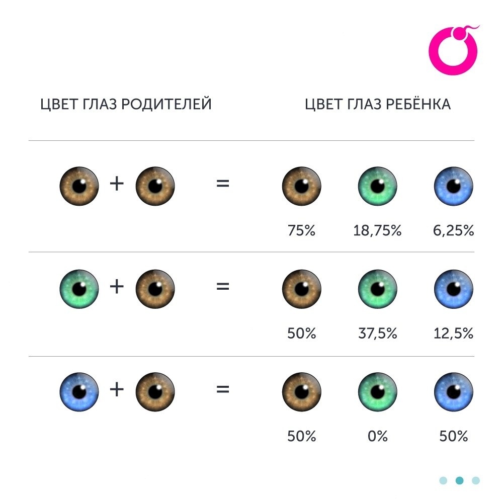 Цвет глаз, как и другие признаки, передаётся от родителей через комбинацию генов. Наука определяет гены, связанные с цветом глаз, как доминантные и рецессивные. Если у обоих родителей тёмные (карие) глаза, вероятность того, что у ребёнка тоже будет тёмный оттенок, высока, так как карий цвет глаз считается доминантным. Рецессивные гены чаще связаны с голубыми, зелёными и серыми глазами, и для их проявления требуется, чтобы ребёнок унаследовал по одному такому гену от каждого. Цвет глаз — это не только генетика, но и уникальное сочетание количества меланина в радужной оболочке, а также отражающей способности глаза. Со временем цвет глаз у детей может измениться. У новорождённых часто светлые глаза, которые темнеют по мере увеличения количества меланина. 3