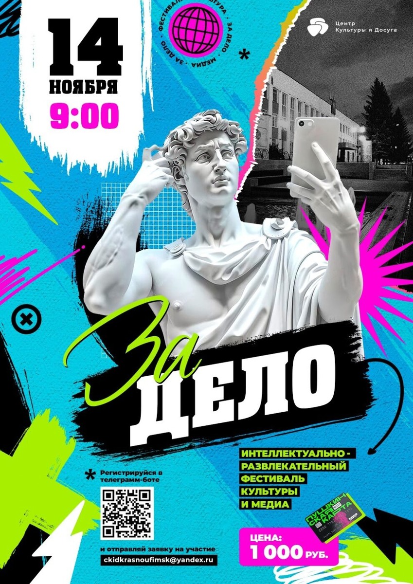 Публикуем программу мероприятий на ближайшие дни. Внимание, она может меняться и дополняться. 14 ноября 9.00 — фестиваль культуры и медиа (ЦКиД, 12+, подробности здесь); 11.00 — соревнования по футболу памяти Игоря Смирнова среди учащихся школ, реализующих адаптированные основные общеобразовательные программы, и членов общества инвалидов «Надежда» (ФОЦ «Сокол», 6+); 17.00 — экскурсия в музей сохранения русской иконы для для участников проекта «Семейный клуб «СемьЯ» (6+); 15 ноября, 17.00 — мастер-класс «Создание идеального образа» в рамках клуба по интересам «Для тебя» (ЦКиД, 12+). 16 ноября Начало чемпионата по мини-футболу среди мужских любительских команд, сезон 2024-2025 (ФОЦ «Сокол», 6+); начало чемпионат г. Красноуфимска по быстрым шахматам (Шахматный клуб, 6+); 10.00 — форум «Поисковики отряда «ЛизаАлерт» (школа №7, 6+); 10.00 — региональные соревнования «Бокс против наркотиков» (ФОЦ «Сокол», 6+); 11.00 — второй городской конкурс чтецов «Читаем Тулина» (ЦКиД, 6+, положение здес