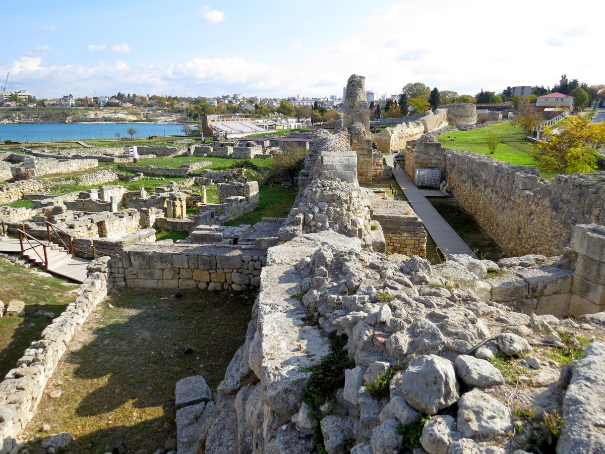 Снова на проходной посмотрели мой рюкзачок, сумочку и меня. И вот я здесь! Привет руины главного входа! Сегодня я просто посмотрю на вас издали. Как бы ни был прекрасен и грандиозен Новый Херсонес, а душе милее эти древние развалины. Среди них можно просто походить, погрузившись в свои думы или мечты, Можно просто рассматривать остатки стен и размышлять, что где было, и как. А можно и совсем ни о чем не думать. Здесь это получается прекрасно! Я прошла к морю, устроилась немного отдохнуть от гонки с фотками. Да и перекусить бы уже пора! Как приятно сидеть в такой прекрасный солнечный день, смотреть, как ветер гонит волны, слушать шум моря и пить чай с булочками! А вокруг – вечность! Много по Херсонесу в этот раз я не ходила, прошлась тихонько по жилым древним кварталам, окутанным тишиной. Махнула головой приветствие Туманному колоколу. Помните, Anna Seton писала про него стих - Туманный колокол.! Дошла до любимой базилики с колоннами. Подробно об объектах ничего не рассказываю, пот