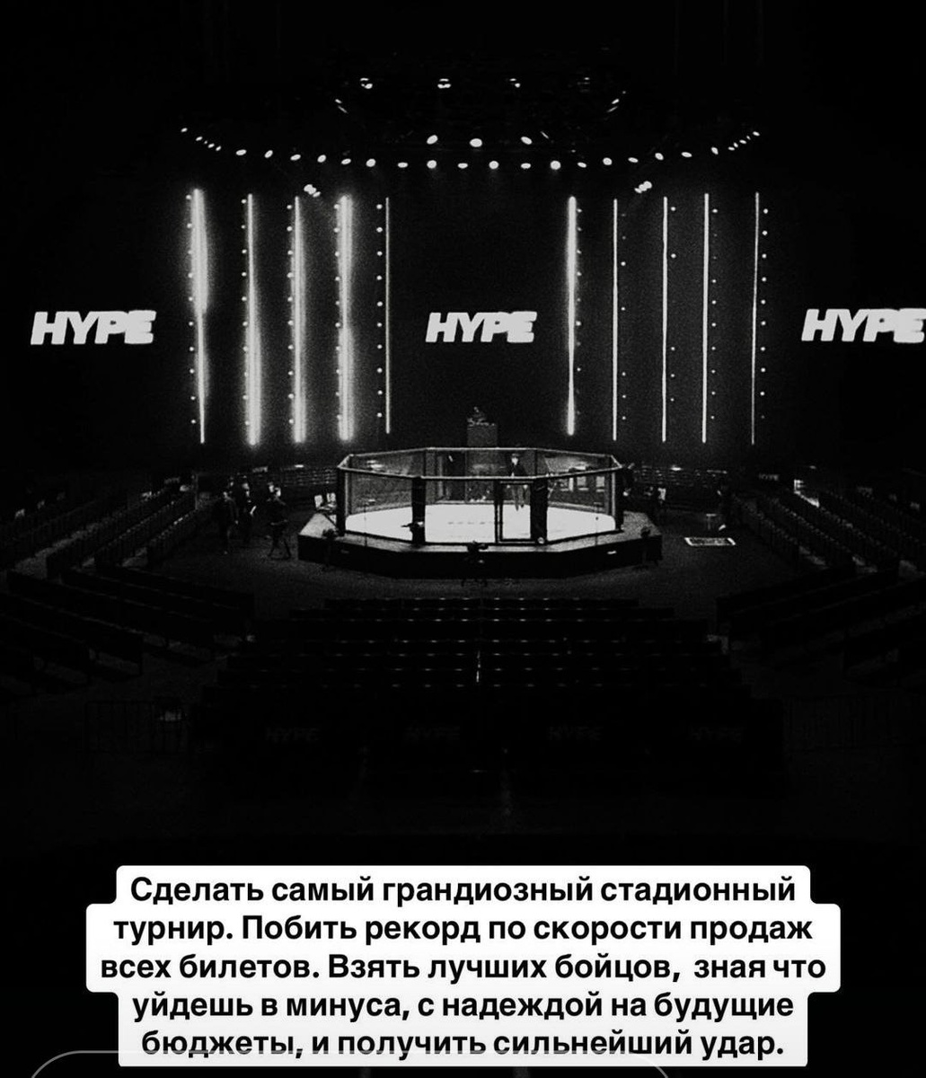 Представители силовых ведомств сорвали турнир поп-MMA лиги Hype Fighting в московском Live Hall, организованный блогером из Волгограда Альфредо Аудиторе. Мужчина в пиджаке показал знак «стоп» прямо во время речи создателя промоушена Альфредо Аудиторе. По данным Mash, его увезли на медосвидетельствование. Перед началом боев Аудиторе на сцене успел анонсировать "лучшие бои" в стране за последние три года «от лучшего в стране промоушена с лучшим в стране боссом» и упомянул, как много средств было вложено. Носаев уточнил, что 8000 билетов организаторы продали за 8 дней. После инцидента точные причины срыва официально не комментировали. Не внес ясности и сам Аудиторе, который в запрещенной в РФ соцсети опубликовал печальное сообщение. — Сделать самый грандиозный стадионный турнир. Побить рекорд по скорости продаж всех билетов. Взять лучших бойцов, зная, что уйдешь в минуса с надеждой на будущие бюджеты и получить сильнейший удар, — гласило сообщение на фото черно-белого снимка арены*. *21 м