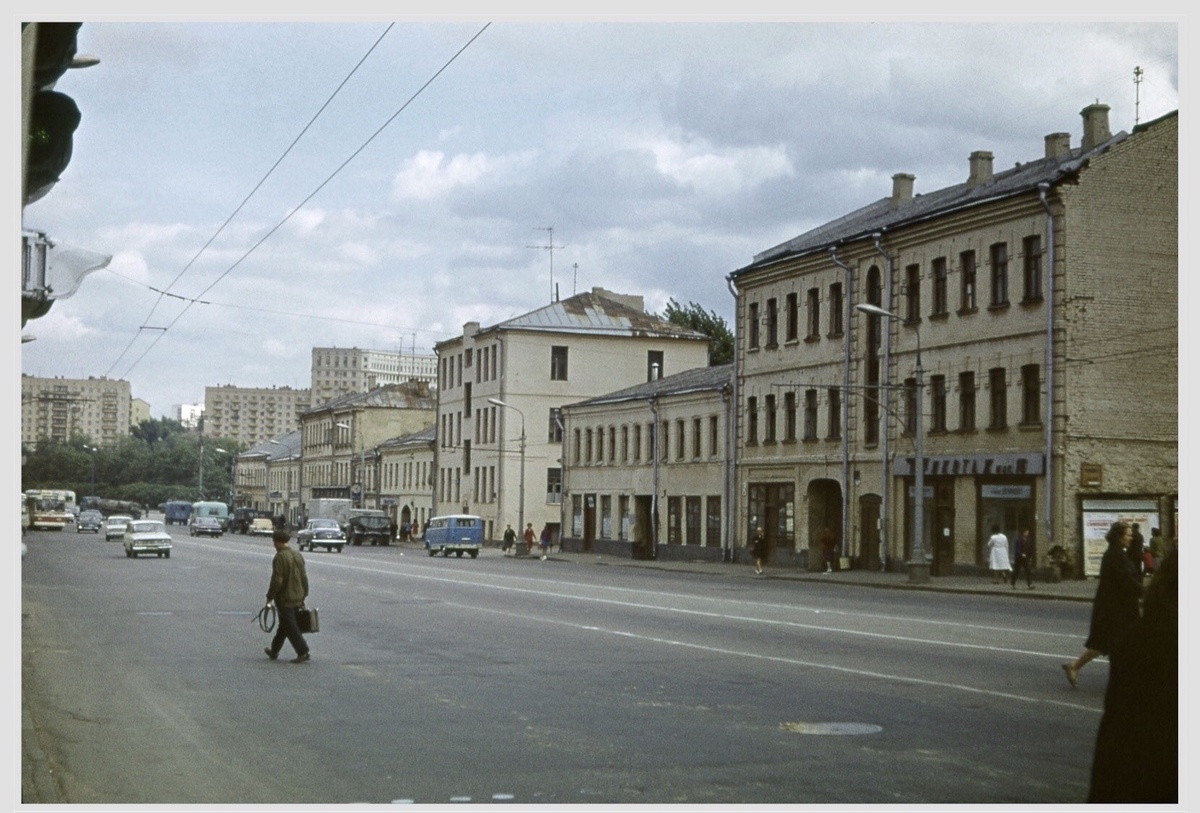 Давайте совершим очередное путешествие сквозь время, пройдёмся по улицам родного города, посмотрим, как всё выглядело тогда и что изменилось за прошедшие десятилетия. Поехали! ... В кадре улица Большая Дорогомиловская уходящая к Бородинскому мосту, перекинутому через Москву-реку. По правой стороне за кварталом старой застройки располагается Киевский вокзал. Фото 1973 года, Сергей Бессмертный Сейчас на месте той застройки стоит огромный торговый комплекс, но построили его на месте сквера, который был обустроен ещё в семидесятых годах, когда снесли все те старые домики, что были в кадре Это вид на противоположную сторону Большой Дорогомиловской улицы. Фото 1973 года, Сергей Бессмертный Здесь тоже всё было снесено подчистую, после чего на части освободившейся территории обустроили зелёную зону, а на другой построили многоподъездные жилые дома. В наши дни на заднем плане начал расти частокол небоскрёбов Теперь мы на площади Ильича. Это вид от Рогожского вала. Здесь запечатлен процесс строи