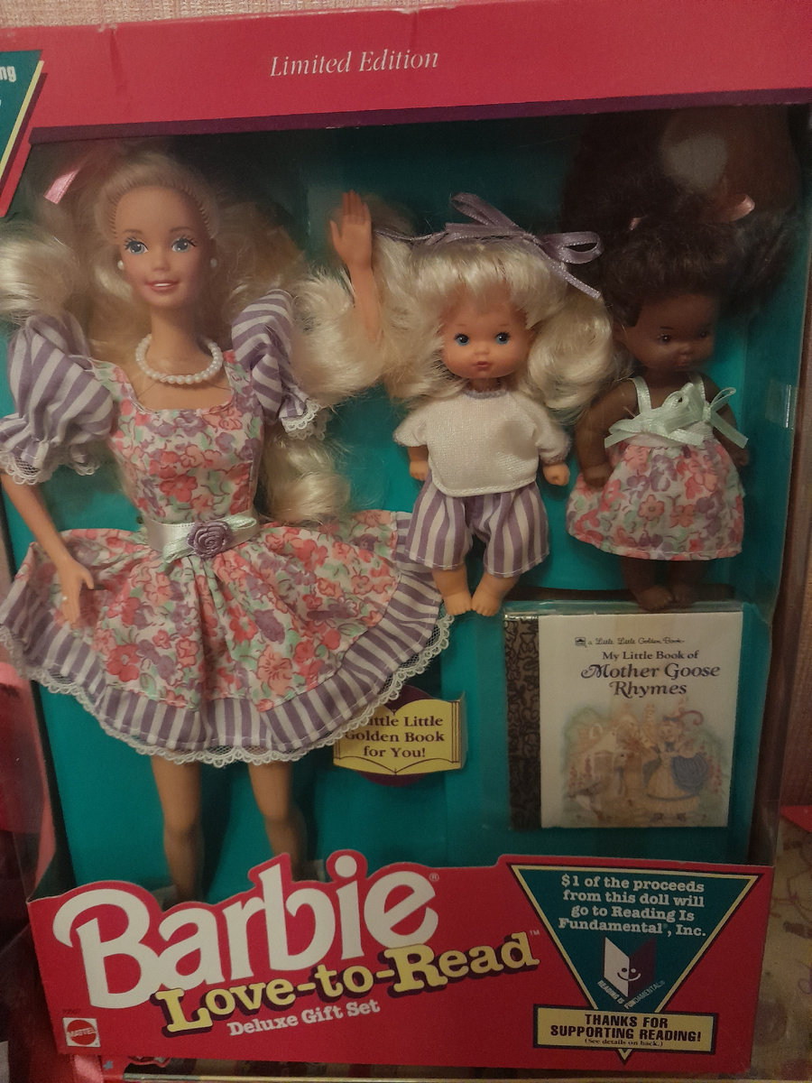 И я люблю) оооочень люблю) Кстати, когда выбирала смайлик для статьи, обнаружила, что девочки с книжкой нет, только мальчик-ученик (или учитель?), хотя есть профессии и спорт, и маникюр и т д. и т.п. Недоработочка🧐 У меня уже есть мотивирующая Барби "Пейте, детки, молоко", как я её называю: Когда я узнала, что Маттел в 1992 году выпустил набор Barbie-love-to-read, сразу поставила себе галочку) но встречался он довольно редко, и вот теперь повезло💖💖💖 Этот набор надо брать непременно нрфб. Барби читает двум малышкам-роузбадикам чудесную книгу "Сказки Матушки Гусыни". Оборотная сторона: Барби читает малышкам, рассевшимся кружком, прекрасные Сказки Матушки Гусыни (если кратко), а они ей говорят: "Мы так любим, когда ты нам читаешь! И не можем дождаться, когда научимся читать сами!" Очень ценно, что эта куколка мотивирует не только детишек читать, но и их родителей читать своим детям и прививать любовь к чтению! Я сама из читающий семьи, своим детям читала с детства (сейчас ещё читаю сы