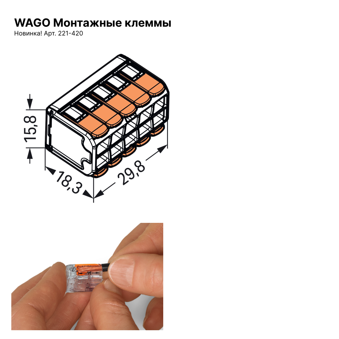 Новинка в серии прозрачных коннекторов WAGO с оранжевыми размыкателями – 10-контактный (!) соединитель, артикул 221-420. Имеет 2 ряда по 5 контактов, имеющих общую шину. Габаритные размеры приведены на картинке: они предельно компактные. В остальном, клемма аналогична другим соединителям серии 221: также можно соединять многожильные или одножильные медные проводники до 4мм2, а прозрачный корпус позволит проверить корректность подключения. Также напомним о важных моментах при работе с клеммниками: – Не работайте под напряжением/нагрузкой; – Используйте только по назначению; – Придерживайтесь региональных стандартов (WAGO применяют во всём мире, но нормативы в странах разные); – Вставляйте проводник до упора; – Не используйте грязные или повреждённые компоненты; – Перед работой ознакомьтесь с инструкцией по установке, если сомневаетесь, то лучше обратитесь к профессиональному электрику. Подробная информация на сайте и в тех.листе.