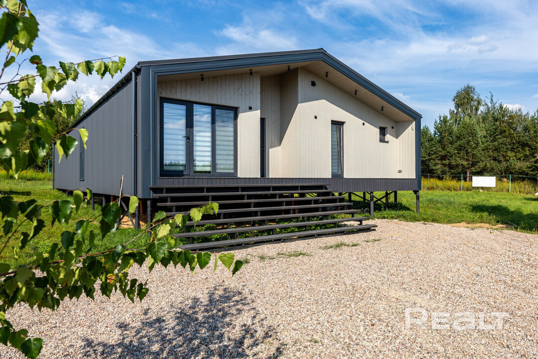 А хотите посмотреть, как может выглядеть современная дача для круглогодичного проживания? Тогда вот вам фоторепортаж из СТ в 20 километрах от Минска – здесь как раз продается дом с продуманной планировкой и крутым интерьером. Он похож на выставочный – и мебель, и техника, и сантехника в нем совершенно новые. А значит, заселяться можно сразу после сделки. Находится дом в СТ «Вектор 2012», рядом Курган Славы, ориентир – деревня Гончаровка. От МКАД – 20 км. Товарищество представляет собой компактный развивающийся поселок. Территория охраняется, с видеонаблюдением. На въезде установлены ворота с дистанционным управлением. Дом расположен на крайней улице, с участка можно выйти в лес. Он каркасный, в стиле барнхаус. Г-образная форма строения позволила создать просторную террасу, выходящую на задний двор. Фундамент свайный, для отделки фасадов использовались деревянный планкен и металл. Строение выделяется большой площадью остекления – все окна в пол. Общая площадь дома – 129 м2. Полы всех п