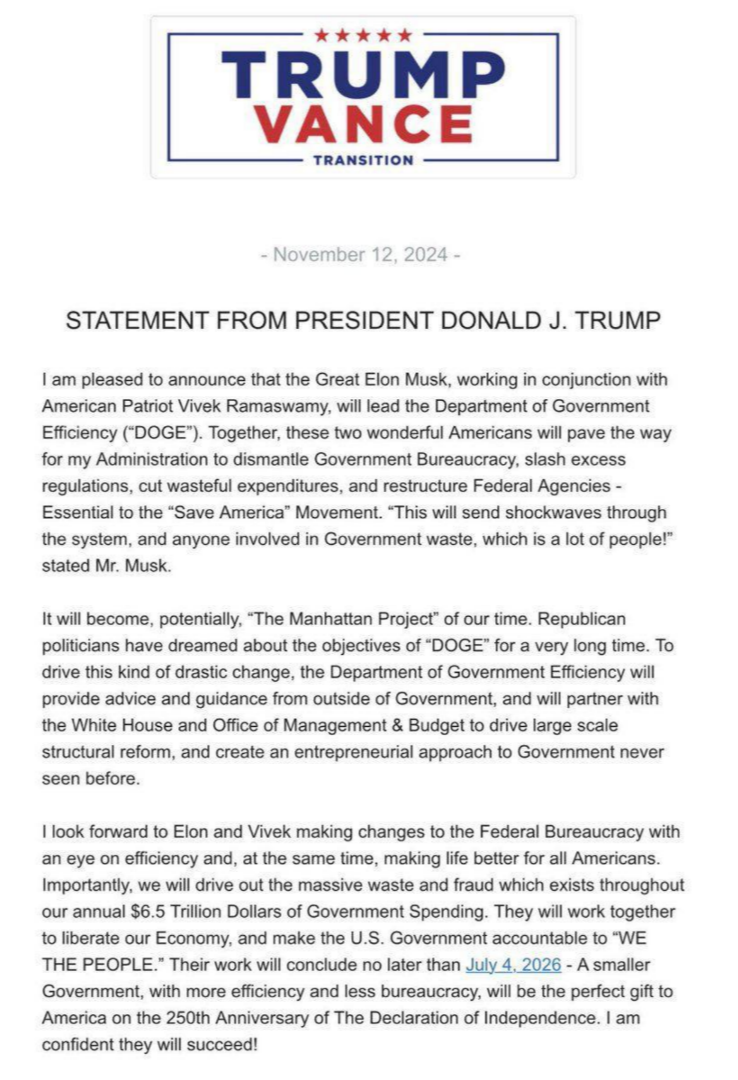 12 ноября 2024 — Я рад сообщить, что великий Илон Маск, работая совместно с американским патриотом Вивеком Рамасвами, возглавит Департамент эффективности государственного управления («DOGE»). Вместе эти два замечательных американца проложат моей администрации путь к упразднению государственной бюрократии, сокращению избыточных правил, бесполезных расходов и реструктуризации федеральных агентств — что необходимо для движения «Спасите Америку». "Это вызовет шок в системе и у всех, кто причастен к растрате государственных средств, а это очень много людей!" - заявил мистер Маск. Потенциально это станет "Манхэттенским проектом" нашего времени. Республиканские политики очень долго мечтали о целях "ДОДЖА". Чтобы добиться таких радикальных изменений, Департамент эффективности государственного управления будет предоставлять консультации и рекомендации извне, а также сотрудничать с Белым домом и Административно-бюджетным управлением, чтобы провести крупномасштабную структурную реформу и соз