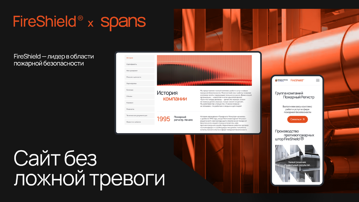 Мы в Spans обожаем крутые задачи, особенно те, где от проектов требуется всегда быть на чеку. И наш клиент FR01 — как раз такой случай. Эта компания — профи в пожарной безопасности. Они делают всё: от противопожарных штор до комплексных решений для защиты. Но не будем углубляться в тонкости их работы, скажем просто: всё, что может гореть, FR01 спасёт. Когда задача — огонь FR01 пришёл к нам с целью объединить два сайта: «Пожарный регистр» (услуги по противопожарной безопасности) и Fire Shield" (собственно, производство противопожарных штор). Мы должны были сделать один современный сайт, который покажет всё, что делает FR01, и подчеркнёт их лидерство на рынке. Визуальная задача — сайт должен быть минималистичным и интуитивным, чтобы не отпугнуть клиентов обилием технических деталей, но при этом показать, что FR01 — серьёзный игрок. А ещё — освежить стиль компании и сделать его более привлекательным. Вызов принят! Первым делом — структурировали контент и наладили навигацию. Все основные р