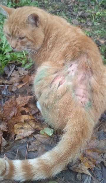 Поступила информация, что под плитой обитает кот, у которого обожжена спина. Сердобольная кормилица пожалела кота и вылила на него пузырек зеленки, после чего он неделю не появлялся, а вчера выполз на передних лапах, задние волочил. Пошла смотреть ситуацию на месте. Кот крупный, не дикий, на контакт идёт. Раны на спине затянулись немного, но есть и незаживающие. Природа ран неизвестна, но похоже на ожег или плеснули кипятком. Из - под плиты появляется чтобы только поесть. Нужна помощь в лечении, сам себя кот вылечить не сможет. Коту нужна передержка хотя бы на время лечения и человек, который сможет за ним ухаживать. Отзовитесь пожалуйста, кто может помочь! 8960 200 61 51 Лидия.