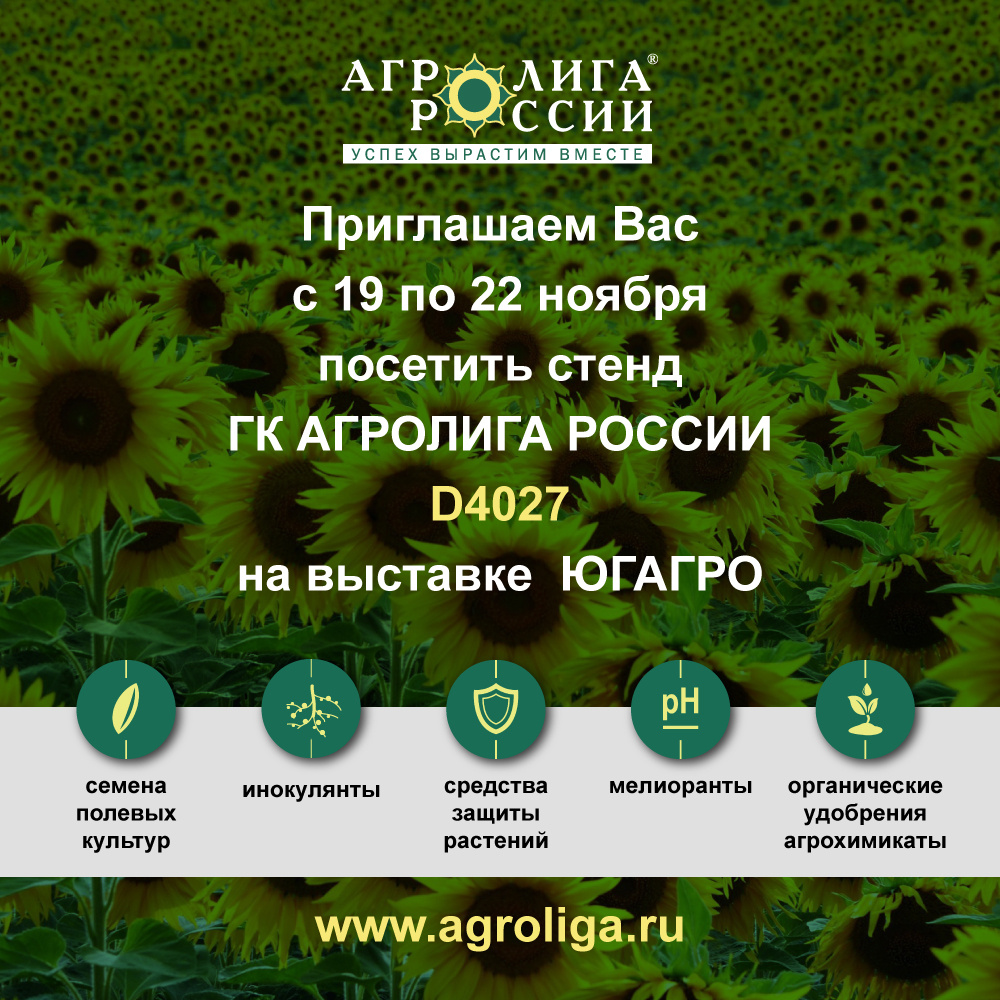 Выставка «ЮГАГРО 2024» - крупнейшая сельскохозяйственная выставка России, которая пройдет с 19 по 22 ноября 2024 г. Приглашаем Вас посетить стенд группы компаний «Агролига России» • №D4027 в павильоне 4 На мероприятии вас ждут: • Презентация новинок продуктового портфеля; • Эксклюзивные товары; • Акции и специальные предложения; • Общение на профессиональные темы и дружеские встречи. Ждем Вас по адресу: г. Краснодар, ул. Конгрессная, д. 1, выставочно-конгрессный комплекс «Экспоград Юг». • Получить бесплатный билет вы можете на сайте выставки: https://yugagro.org/ru/visit/visitor-registration/