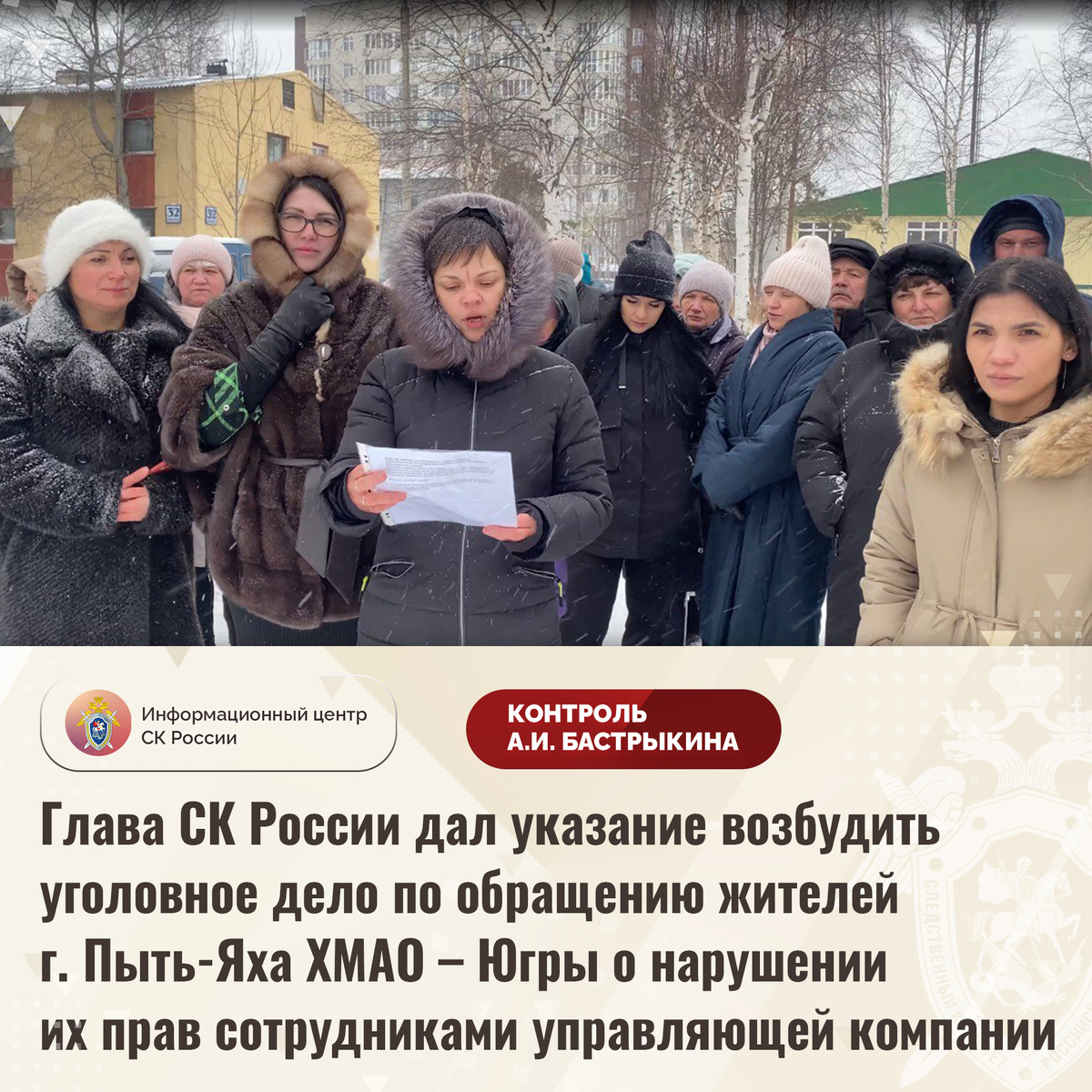 Глава СК России дал указание возбудить уголовное дело по обращению жителей г. Пыть-Яха ХМАО – Югры о нарушении их прав сотрудниками управляющей компании В социальной сети размещено видеообращение к Председателю СК России А.И. Бастрыкину жителей города Пыть-Яха Ханты-Мансийского автономного округа — Югры по вопросу нарушения их прав управляющей компанией ООО «Бизнес центр», сотрудниками которой являются члены одной семьи. Организация ненадлежащим образом осуществляет обслуживание многоквартирных домов, в результате чего их состояние ухудшается и угрожает безопасности граждан. Заявки жильцов на устранение аварий игнорируются, руководством Общества необоснованно завышается стоимость коммунальных услуг. Кроме того, на жалобы заявителей сотрудники компании реагируют агрессивно, высказывая в их адрес угрозы применения физического насилия. Многочисленные обращения в компетентные органы результатов не принесли, виновные к ответственности не привлечены, в чем граждане усматривают коррупционную