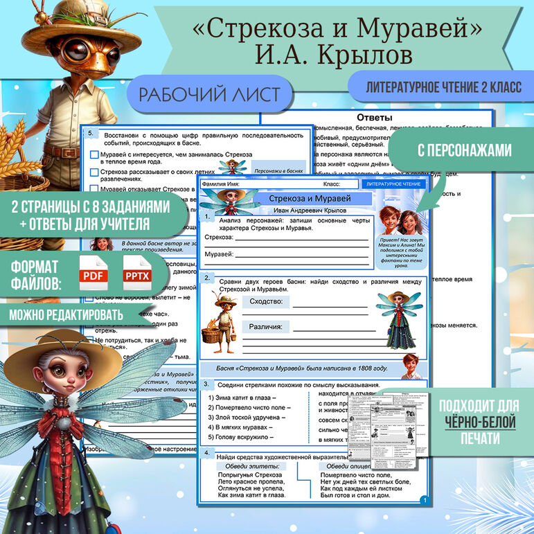Рабочий лист включает задания по басне И.А. Крылова «Стрекоза и Муравей». УМК «Школа России». На 2-х страницах формата А4 расположено 8 интересных, разноплановых заданий + блок рефлексии. На отдельном листе расположены ответы для учителя. Уникальность данного рабочего листа заключается в присутствии персонажей – второклассников Максима и Алины. Они «поделятся» с ребятами различными интересными фактами по теме урока. Список заданий: Представлен в PDF-формате и PPTX-формате (можно редактировать). Рабочий лист «Стрекоза и Муравей» басня И.А. Крылова можно скачать вот здесь. #литературоноечтение #2класс #начальнаяшкола #рабочийлист #2класс #методическаяразработка #образование